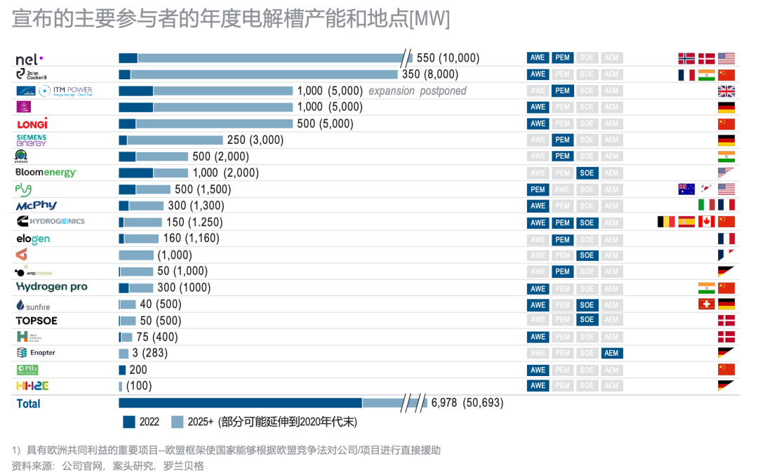 随着全球电解槽OEM产业的不断发展,预计到2025年,生产能力将增加到每年约50GW。然而,目前全球千兆级大型电解槽工厂(Gigafactories)的实际投资仍然较少,这主要取决于订单确认、订单数量、招标流程、下一代产品的研发成熟度以及产业化合作伙伴关系等因素。此外,公共资金投入承诺也是一个重要因素。例如,在欧洲的IPCEI框架下,欧洲的OEM企业如Sunfire、John Cockerill、McPhy、Genvia、H2B2、Elogen、Cummins以及供应商如De Nora、Elcogen等,最近在欧洲委员会批准众多项目(国家援助许可)方面取得了重要进展。