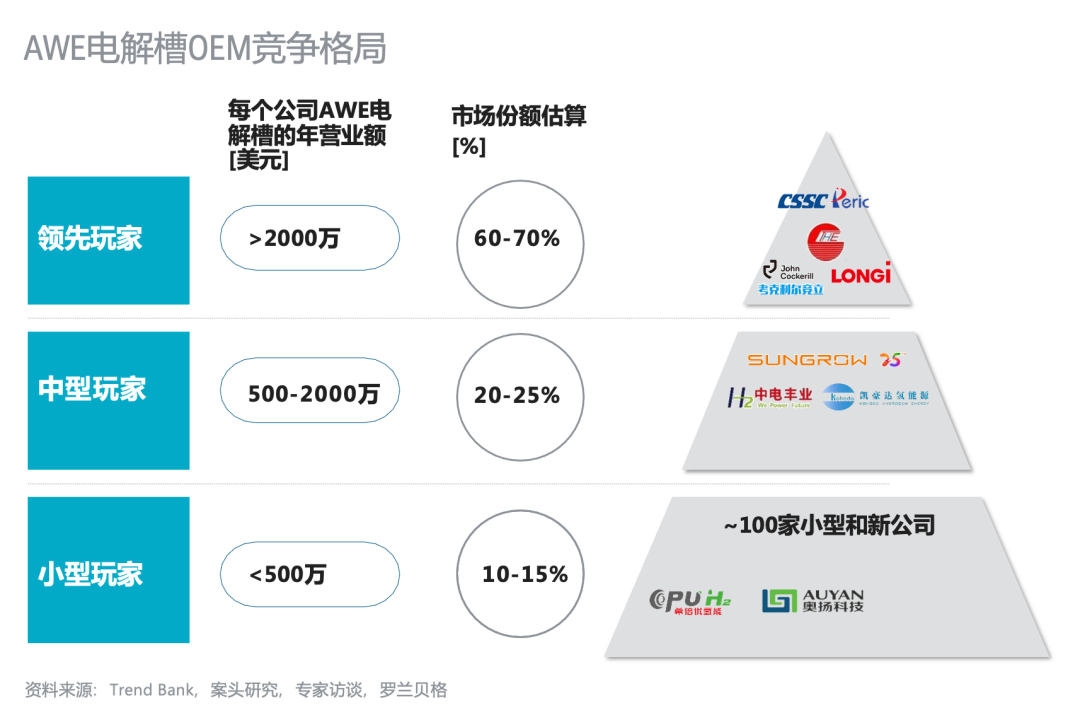 在中国的AWE电解槽市场,四家领先的OEM企业占据了超过60%的市场份额,此外还有许多新兴和小型玩家。自2020年以来,约有100家公司进入了这一市场。其中,许多大型新能源装备制造企业凭借其资本实力和卓越的制造及运营能力成为行业领导者。同时,市场中的中型参与者也在不断壮大,这表明该领域正逐步走向成熟。