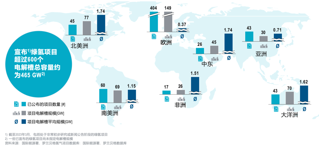 近年来,全球绿氢产业呈现出蓬勃发展的趋势,各地纷纷传出大规模绿氢项目投资的消息。截至2023年3月,全球已宣布超过600余个绿氢项目,总电解槽容量约为465GW。欧洲是全球绿氢投资的领跑者,已宣布的项目数量超过400个,总装机量近150GW。北美、南美和大洋洲紧随其后,这三大市场每个市场宣布的绿氢装机规模均超过70GW,且项目趋于大型化,平均单个项目规超过1GW。中东加速绿色能源投资,已宣布的氢能投资达到26个,装机规模达45GW。相比之下,亚太地区则需加快建设步伐,尽管已宣布43个项目,总装机量仅为30GW,而且单个项目平均装机容量较小。
