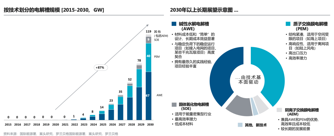 综合考虑市场需求、技术成熟度、项目建设进度和供应链等关键因素,罗兰贝格预测到2030年,全球电解槽需求将达到119GW。