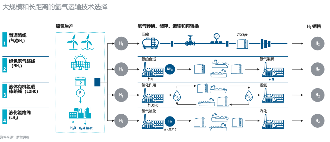 在大规模、长距离的氢气运输中,技术选项包括管道和灵活载体,具有不同的运营和成本特点。所有灵活的氢气载体都有特定用途的优缺点——大规模端到端可行性尚待验证。到目前为止,尚无一种运输技术具有明显的成本优势——选择取决于具体项目。