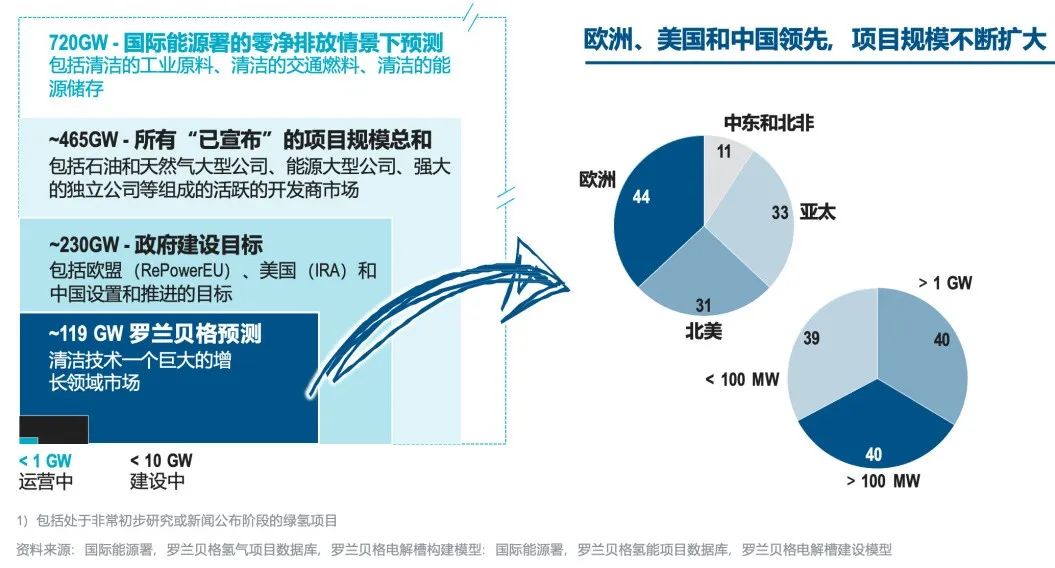 得益于欧洲、美国和中国更大规模的绿氢项目,到2023年,电解槽装机规模迎来前所未有的增长。根据国际能源署的净零排放情景、已宣布的绿氢项目装机总量量以及中、美、欧等政府设定的目标,需要的电解槽装机规模分别为720GW,465GW以及230GW。然而,目前在运行的电解槽容量不足1GW,正在建设的项目不足10GW,远低于发展目标。
