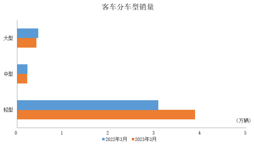 2023年1-3月,客车产销同比微增。在客车主要品种中,与上年同期相比,轻型客车产销呈两位数增长,大型客车产量微增、销量微降,中型客车产销呈明显下降。