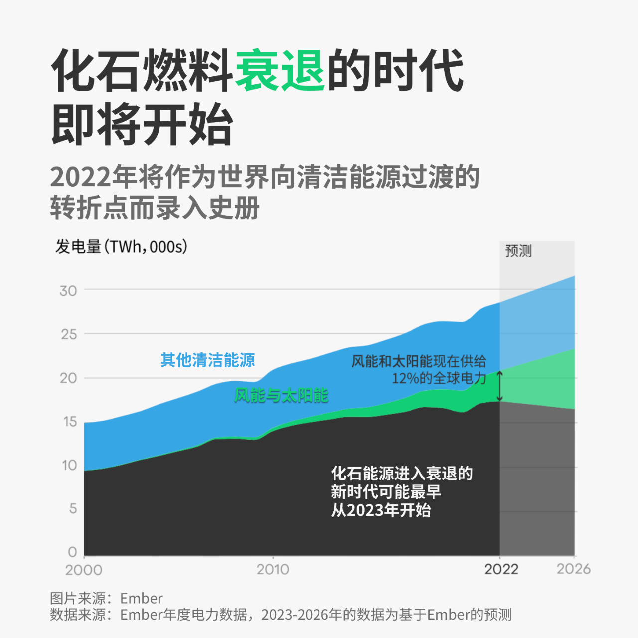 而今年这一数字预计将实现更快的增长。Ember提出,2022年可能标志着一个“转折点”,即全球化石燃料发电量已经达到顶峰并开始下降。