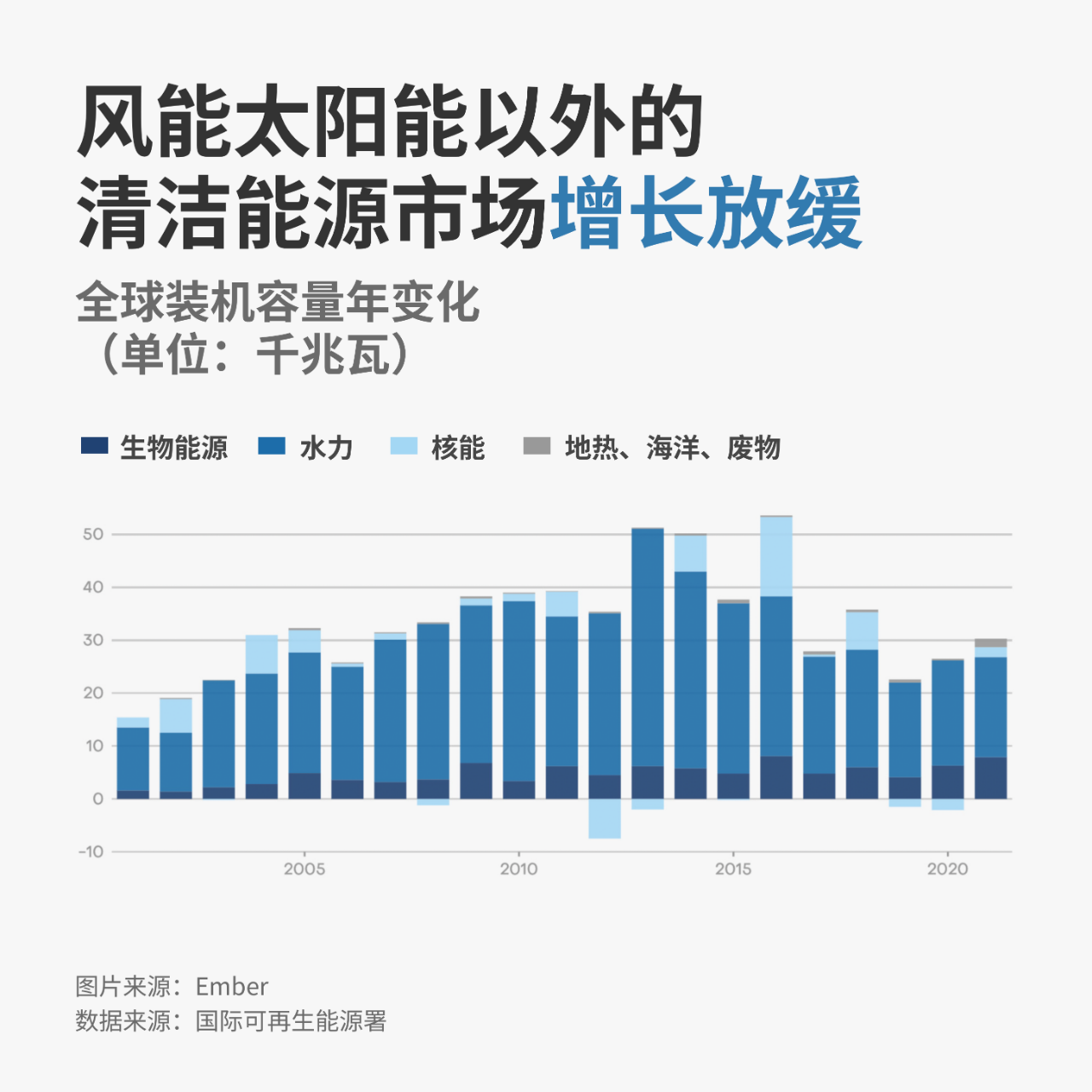 Ember表示,在能源转型的背景下,可再生能源的迅速扩张意味着燃气动力和煤电正在“逐步减少”。然而在此之外,核电和水电建设也需要突破停滞局面。