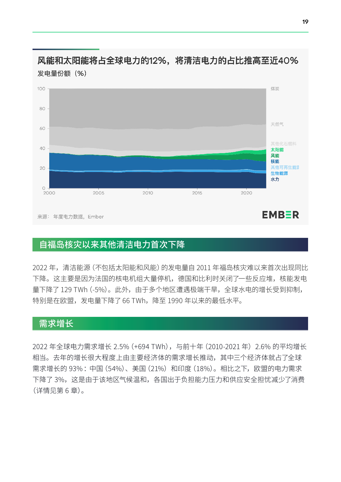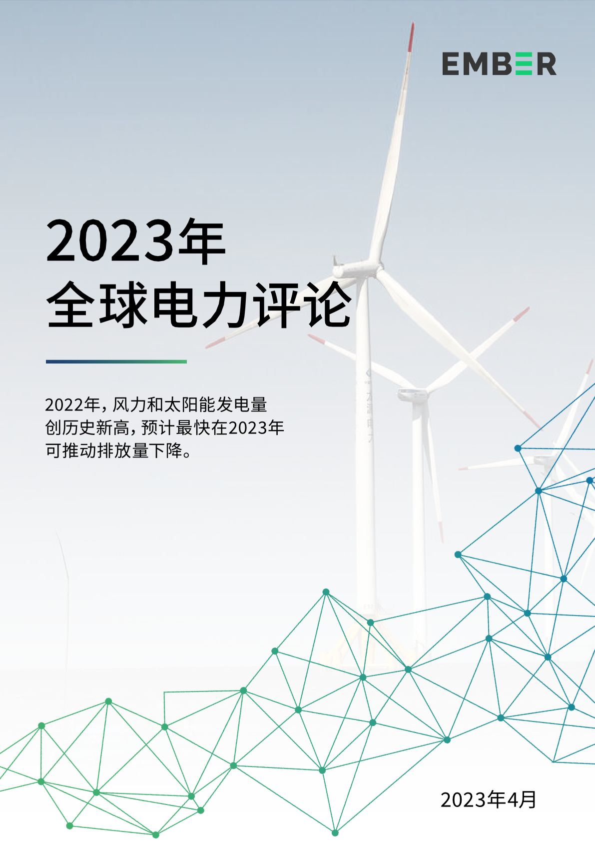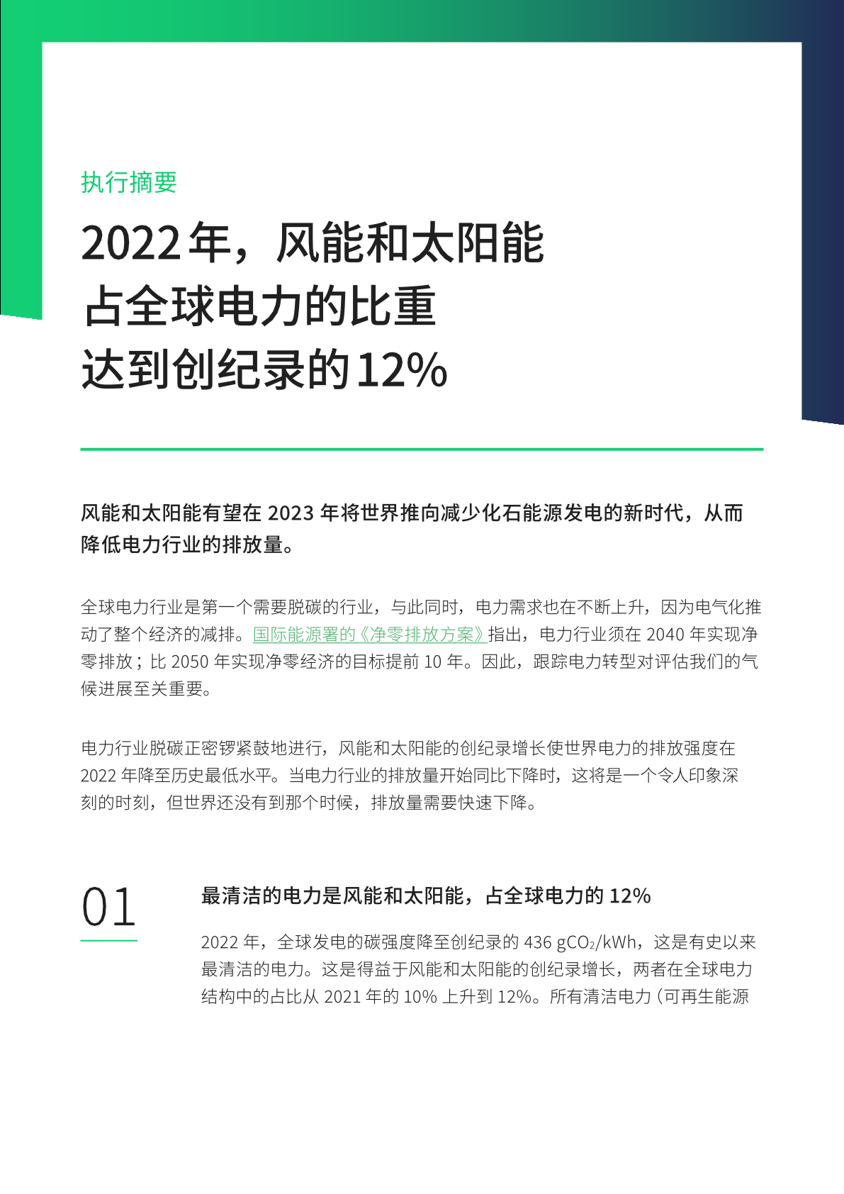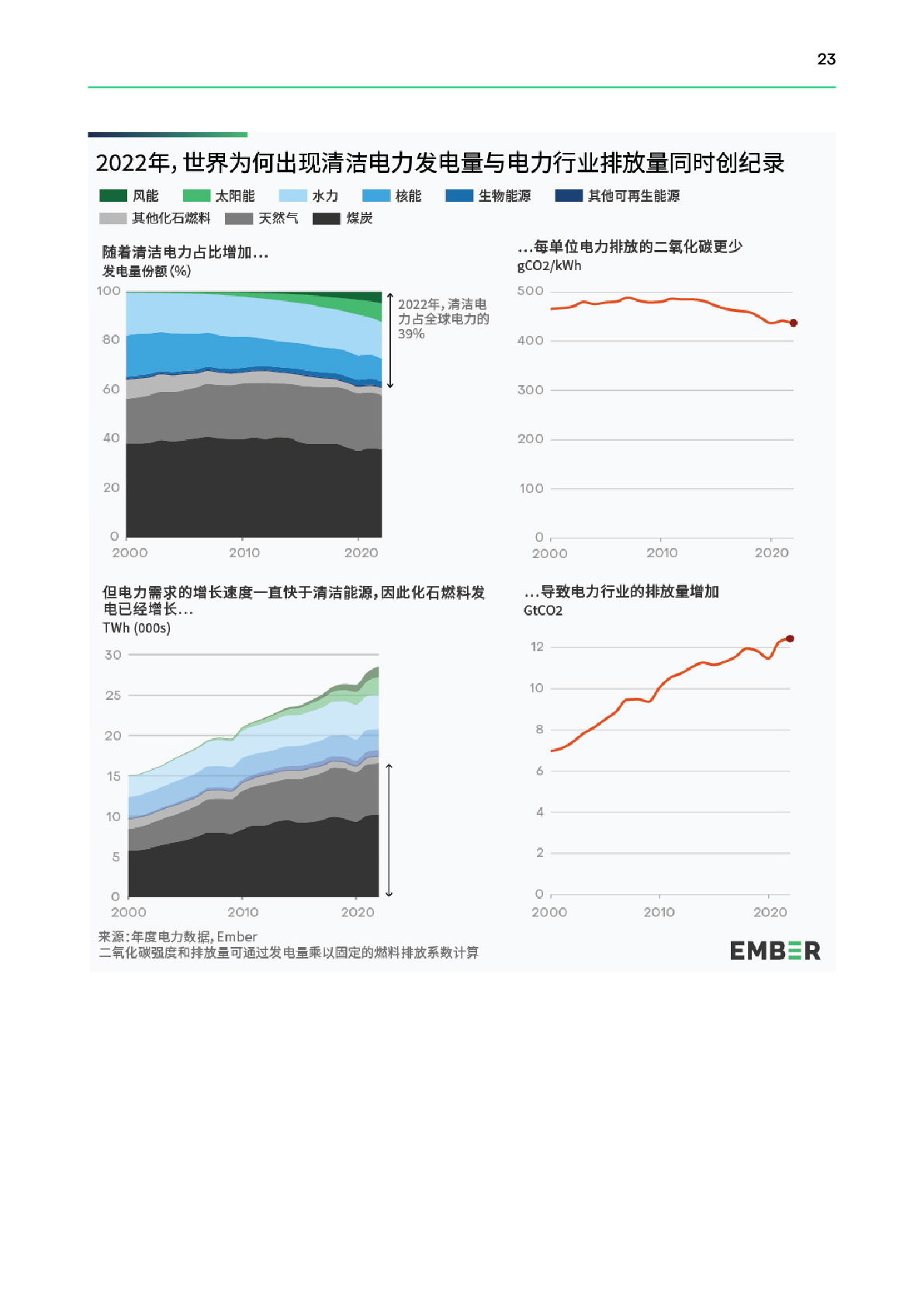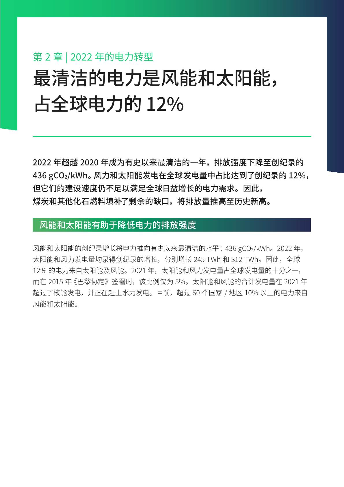 2022年,全球发电的碳强度降至创纪录的436 gCO2/kWh,这是有史以来最清洁的电力。这是得益于风能和太阳能的创纪录增长,两者在全球电力结构中的占比从2021年的10%上升到12%。所有清洁电力(可再生能源和核电)合计占全球电力的39%,创历史新高。太阳能发电量增长24%,连续18年成为增长最快的电力来源;风力发电量增长了17%。2022年全球太阳能发电量的增长可以满足南非一年的电力需求,而风力发电量的增长可以为几乎整个英国提供电力。目前,超过60个国家/地区10%以上的电力来自风能和太阳能。然而,其他清洁电力来源录得自2011年以来的首次下降,原因是核电产量下降,新核电和水电站投产数量减少。