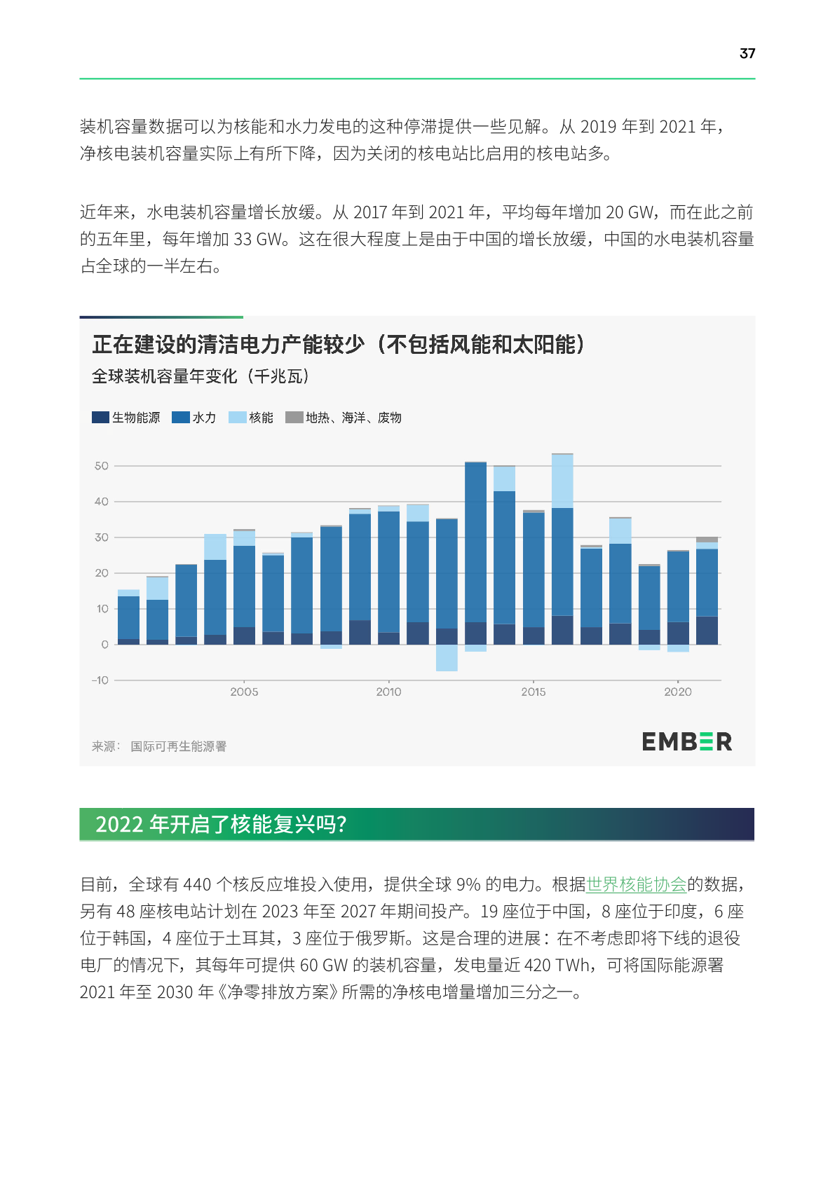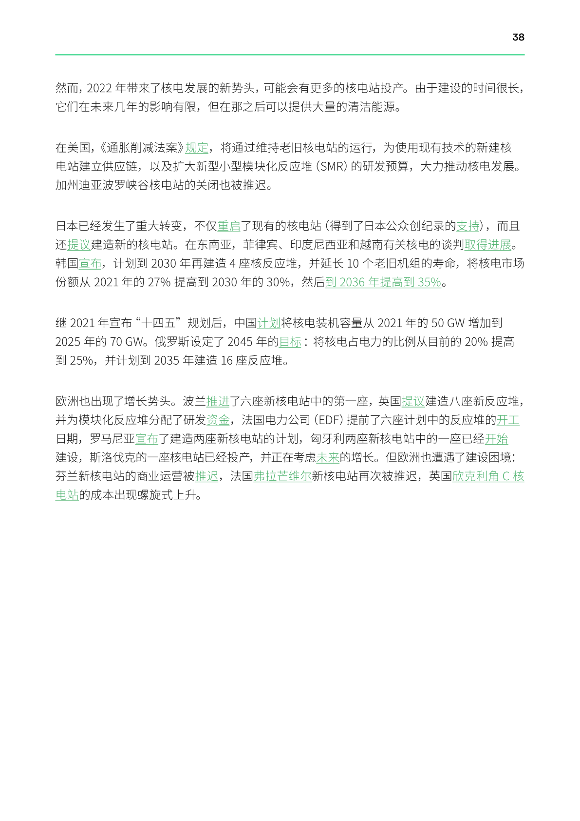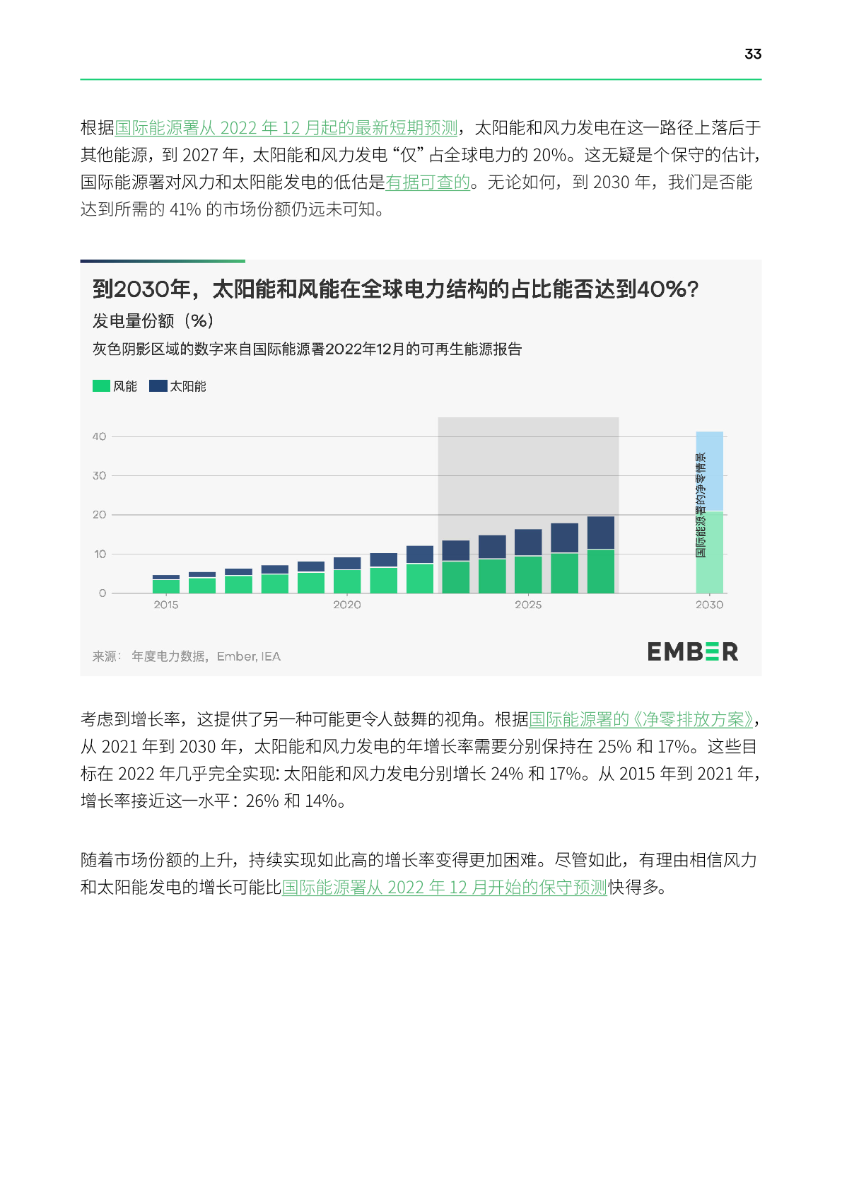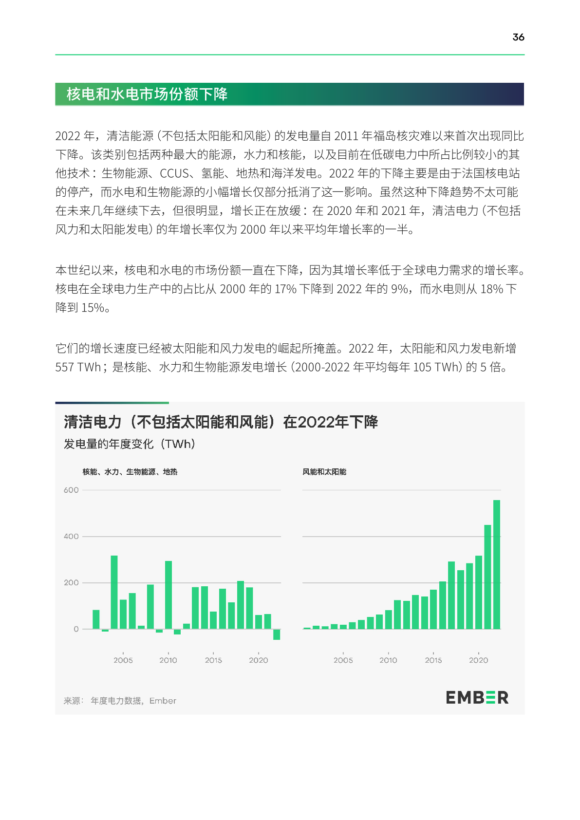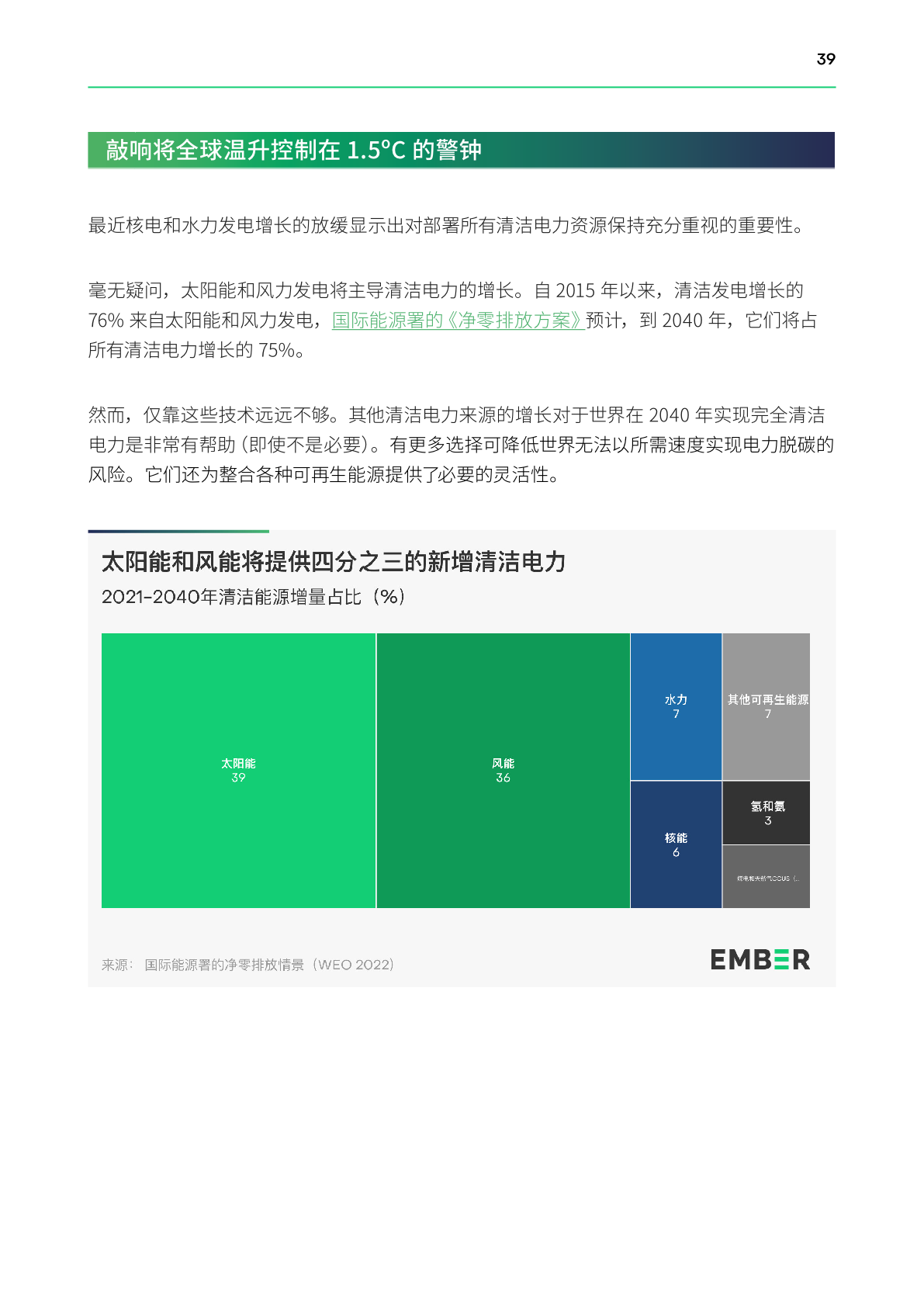 2022年,全球发电的碳强度降至创纪录的436 gCO2/kWh,这是有史以来最清洁的电力。这是得益于风能和太阳能的创纪录增长,两者在全球电力结构中的占比从2021年的10%上升到12%。所有清洁电力(可再生能源和核电)合计占全球电力的39%,创历史新高。太阳能发电量增长24%,连续18年成为增长最快的电力来源;风力发电量增长了17%。2022年全球太阳能发电量的增长可以满足南非一年的电力需求,而风力发电量的增长可以为几乎整个英国提供电力。目前,超过60个国家/地区10%以上的电力来自风能和太阳能。然而,其他清洁电力来源录得自2011年以来的首次下降,原因是核电产量下降,新核电和水电站投产数量减少。