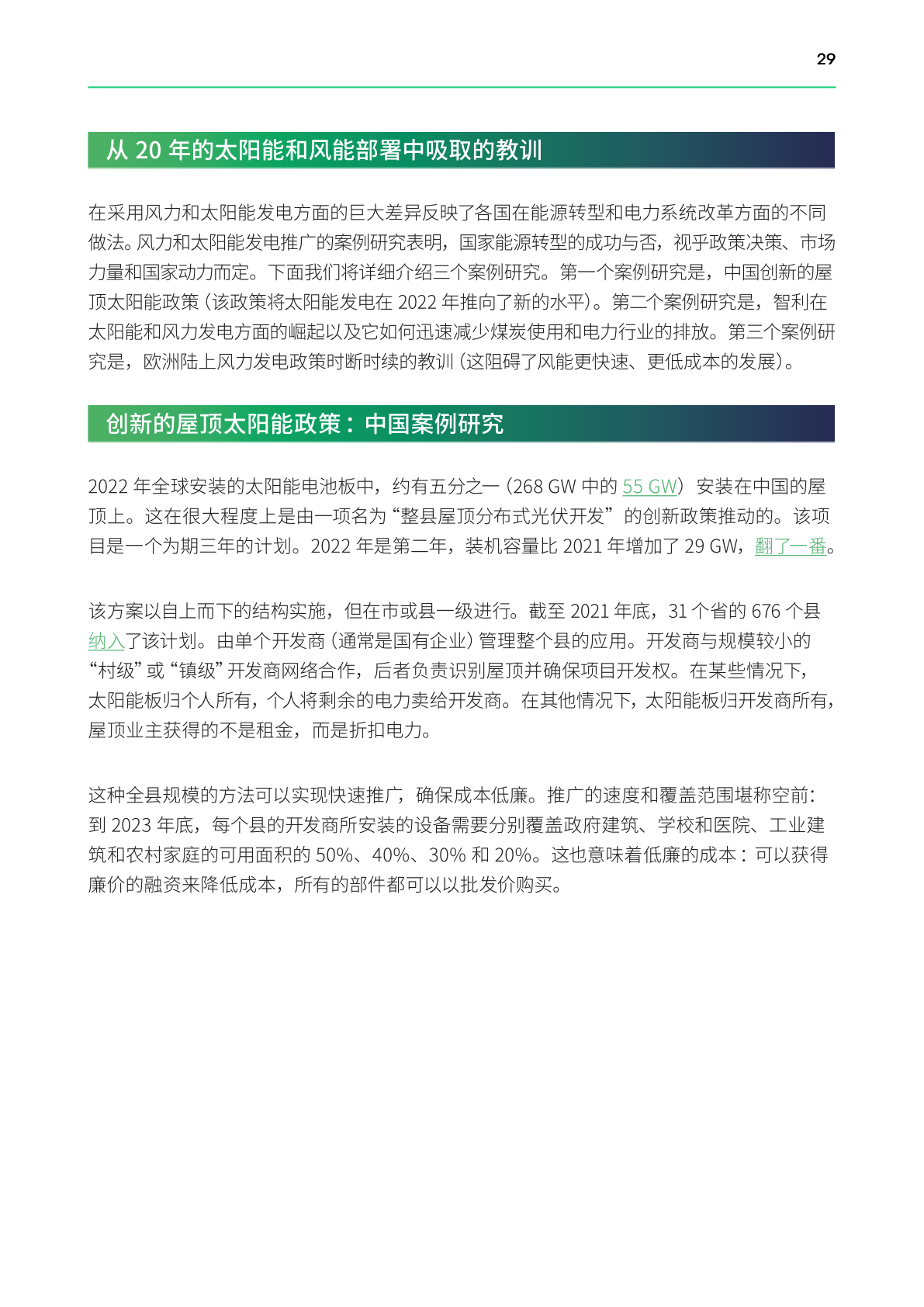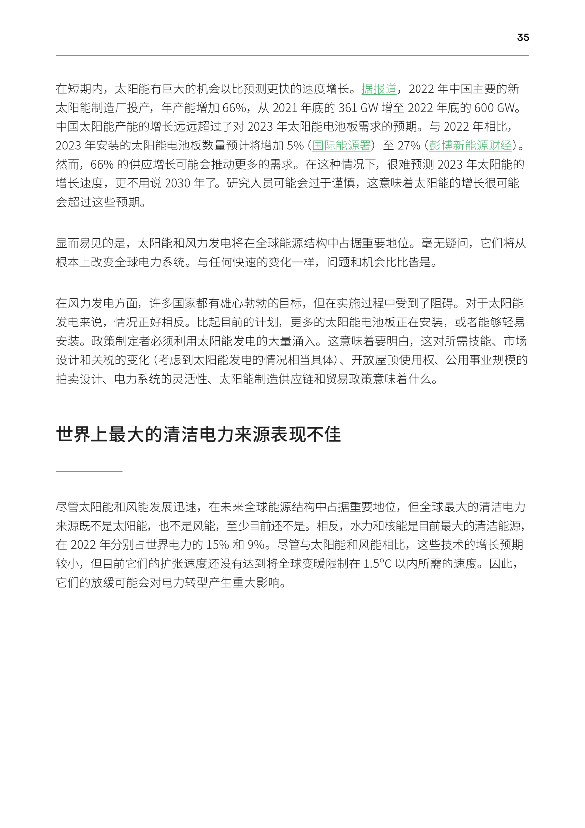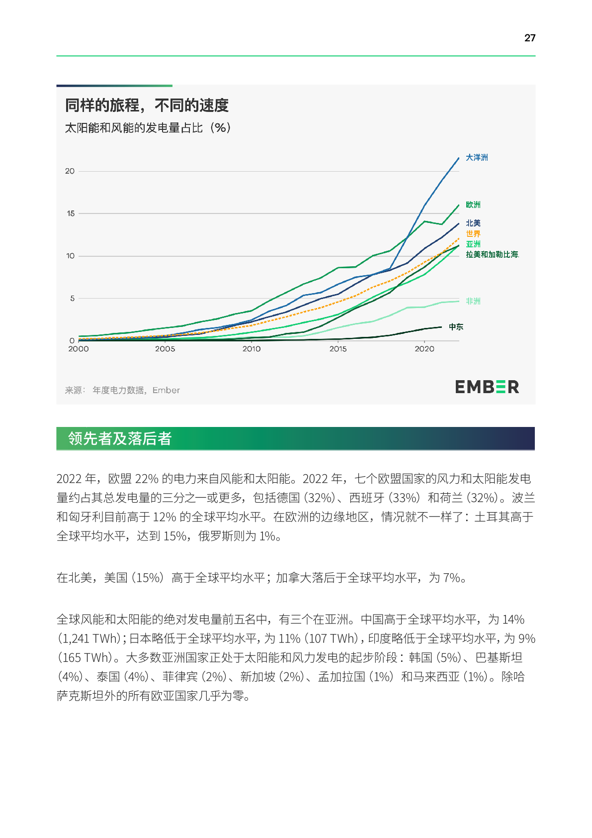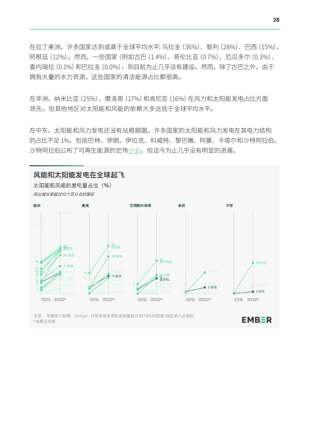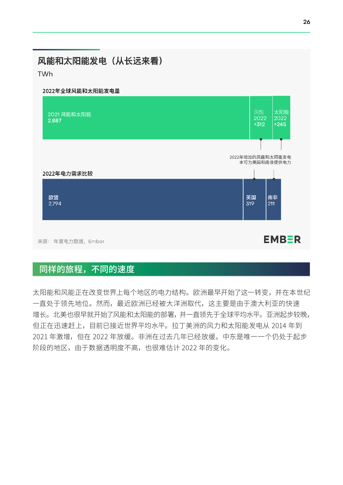 2022年,全球发电的碳强度降至创纪录的436 gCO2/kWh,这是有史以来最清洁的电力。这是得益于风能和太阳能的创纪录增长,两者在全球电力结构中的占比从2021年的10%上升到12%。所有清洁电力(可再生能源和核电)合计占全球电力的39%,创历史新高。太阳能发电量增长24%,连续18年成为增长最快的电力来源;风力发电量增长了17%。2022年全球太阳能发电量的增长可以满足南非一年的电力需求,而风力发电量的增长可以为几乎整个英国提供电力。目前,超过60个国家/地区10%以上的电力来自风能和太阳能。然而,其他清洁电力来源录得自2011年以来的首次下降,原因是核电产量下降,新核电和水电站投产数量减少。