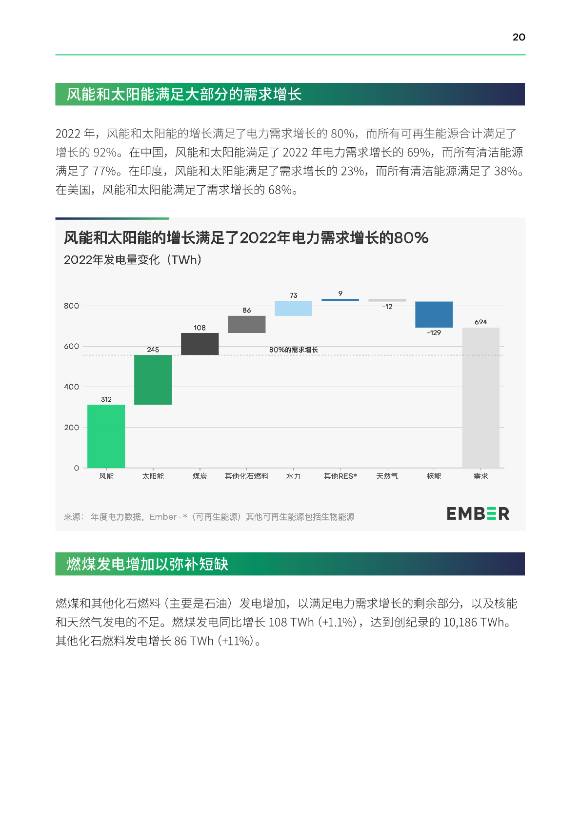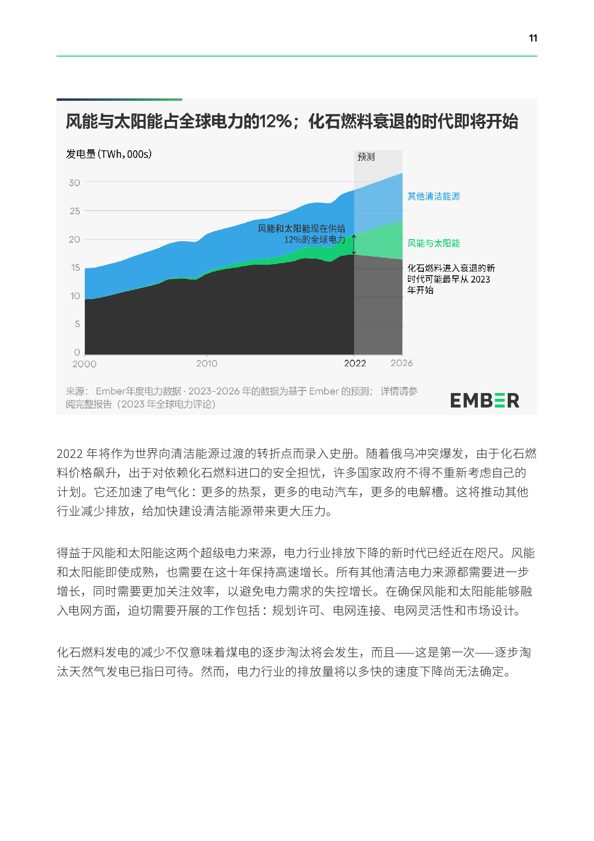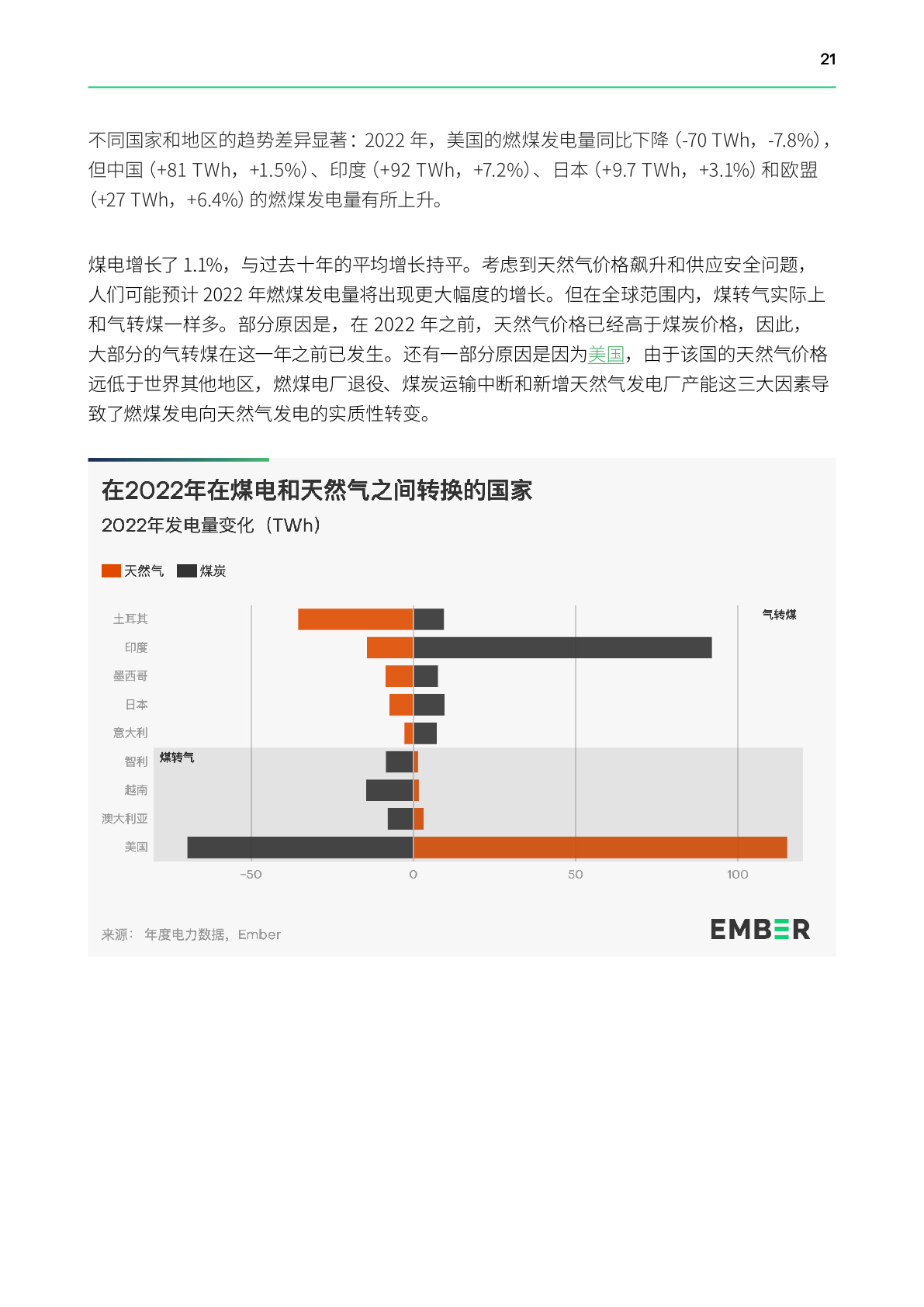 风能和太阳能正在减缓电力行业排放的增长。如果所有来自风能和太阳能的电力都来自化石燃料发电,那么2022年电力行业的排放量将增加20%。仅风力和太阳能发电的增长(+557 TWh)就满足了2022年全球电力需求增长的80%(+694 TWh)。2023年,清洁能源的增长可能会超过电力需求的增长;这将是第一次在经济衰退之外实现这一目标。根据电力需求和清洁能源的平均增长,我们预测2023年化石燃料发电量将小幅下降(-47 TWh,-0.3%),而随着风能和太阳能的进一步增长,未来几年将出现更大的下降。这也意味着2022年的排放量已达到“峰值”。电力行业排放下降的新时代即将到来。
