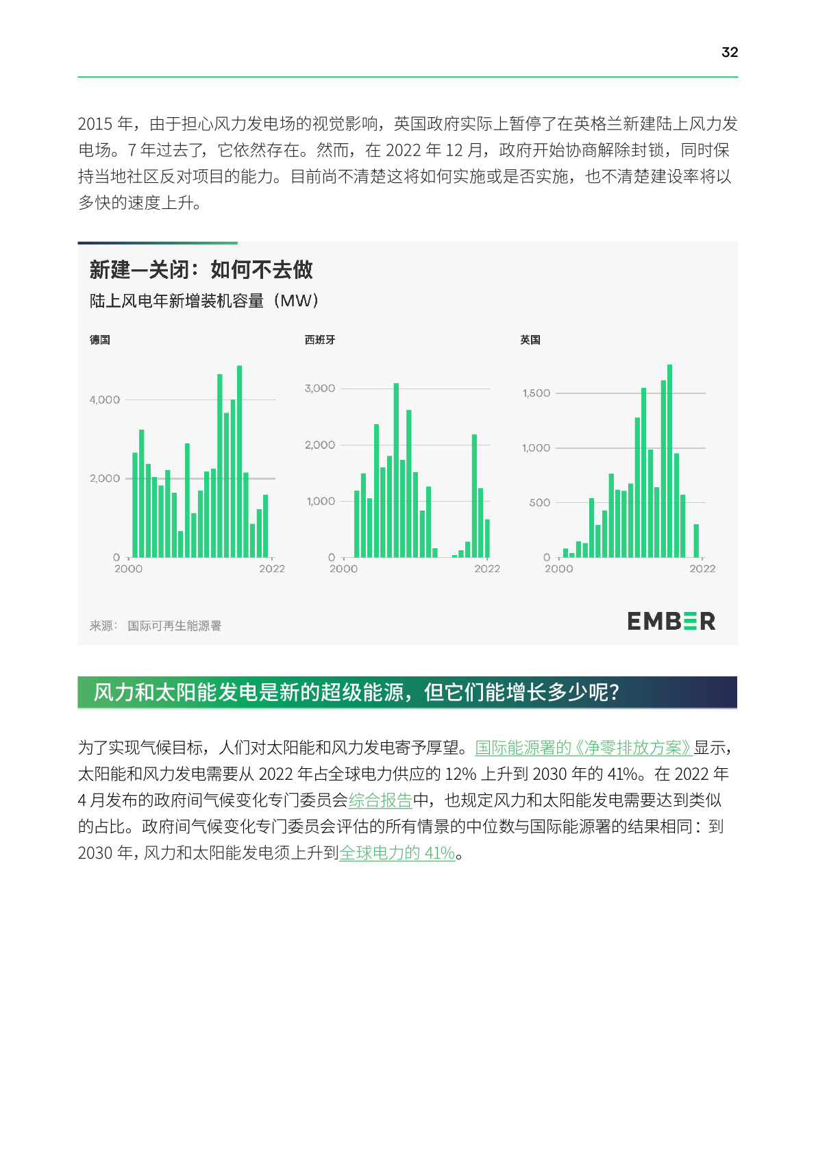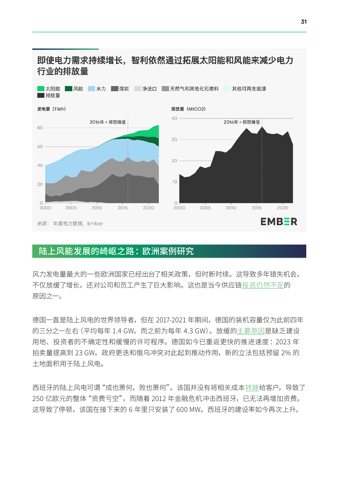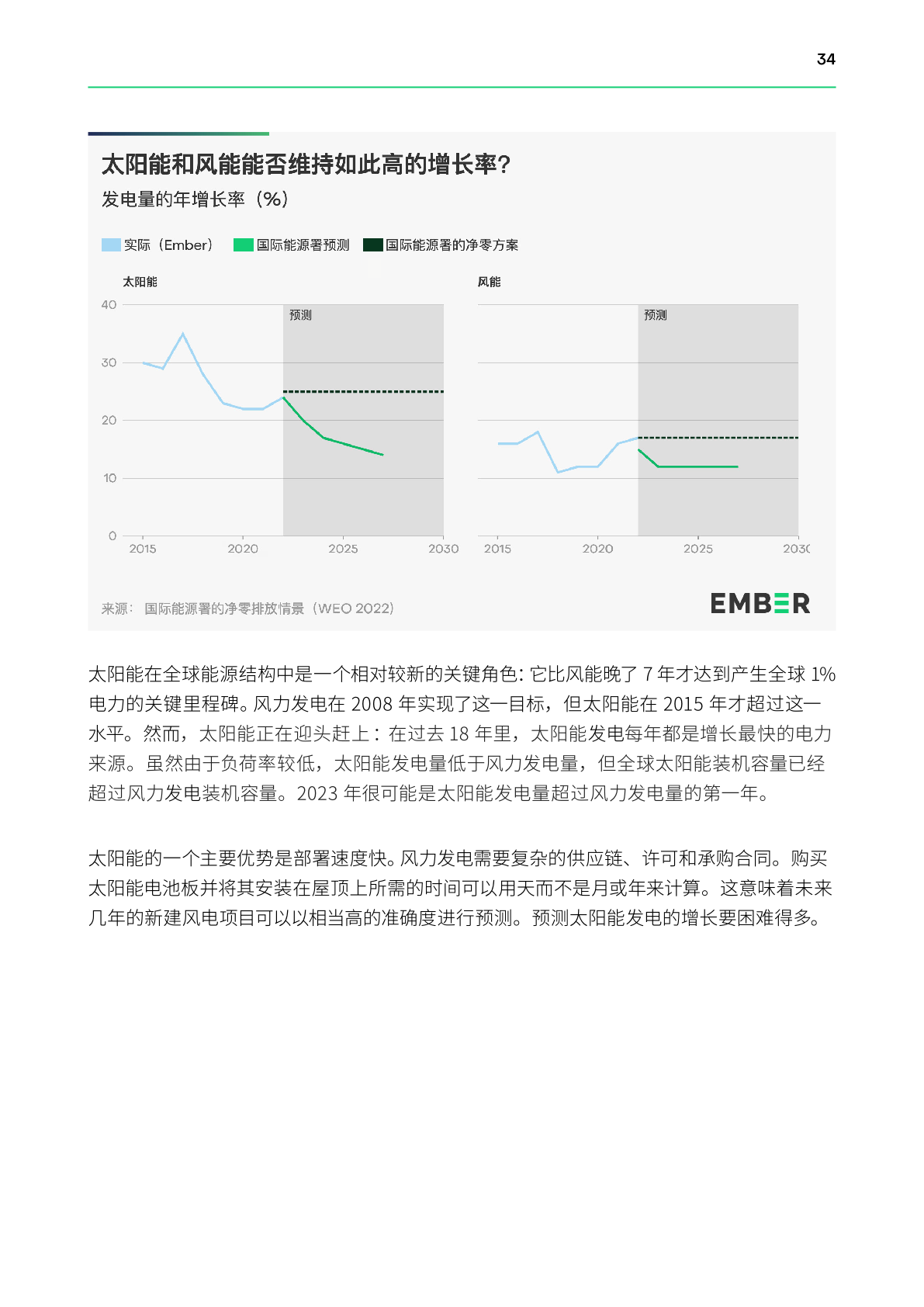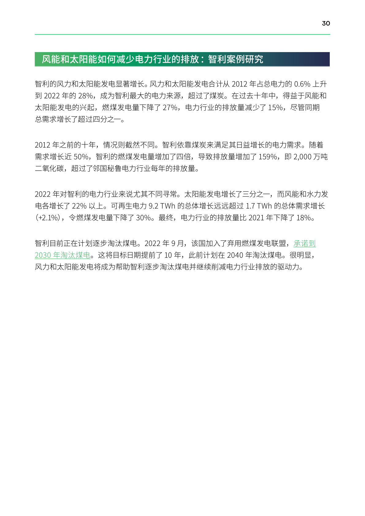 风能和太阳能正在减缓电力行业排放的增长。如果所有来自风能和太阳能的电力都来自化石燃料发电,那么2022年电力行业的排放量将增加20%。仅风力和太阳能发电的增长(+557 TWh)就满足了2022年全球电力需求增长的80%(+694 TWh)。2023年,清洁能源的增长可能会超过电力需求的增长;这将是第一次在经济衰退之外实现这一目标。根据电力需求和清洁能源的平均增长,我们预测2023年化石燃料发电量将小幅下降(-47 TWh,-0.3%),而随着风能和太阳能的进一步增长,未来几年将出现更大的下降。这也意味着2022年的排放量已达到“峰值”。电力行业排放下降的新时代即将到来。