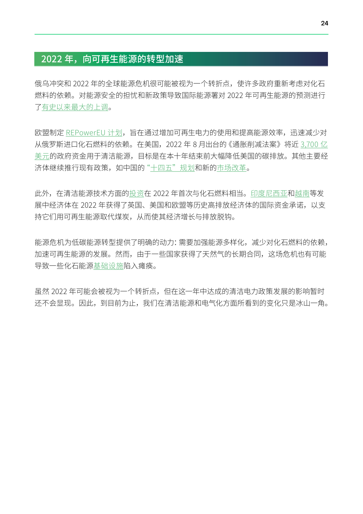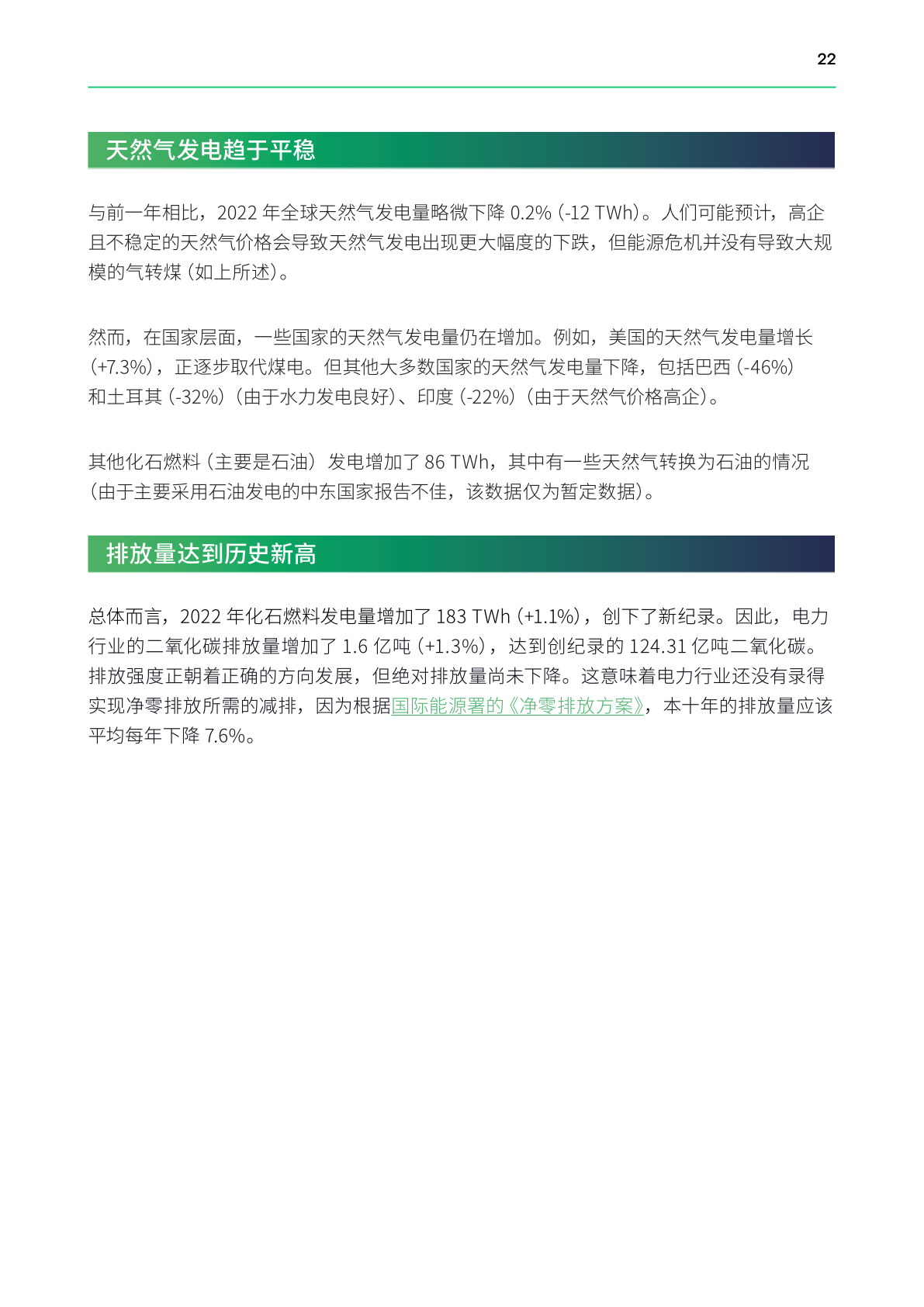 电力行业脱碳正密锣紧鼓地进行,风能和太阳能的创纪录增长使世界电力的排放强度在2022年降至历史最低水平。当电力行业的排放量开始同比下降时,这将是一个令人印象深刻的时刻,但世界还没有到那个时候,排放量需要快速下降。