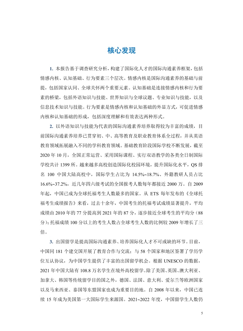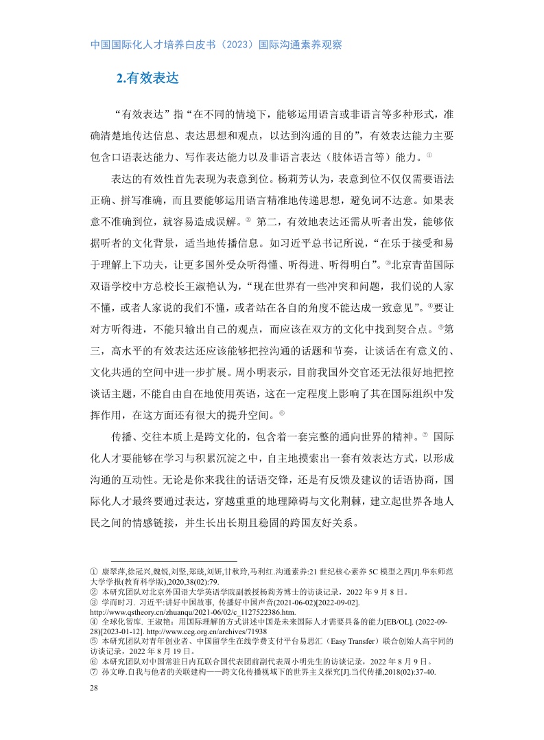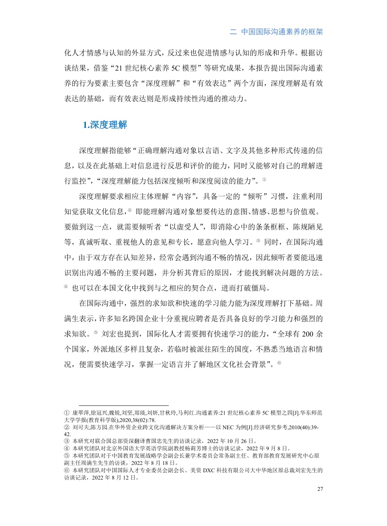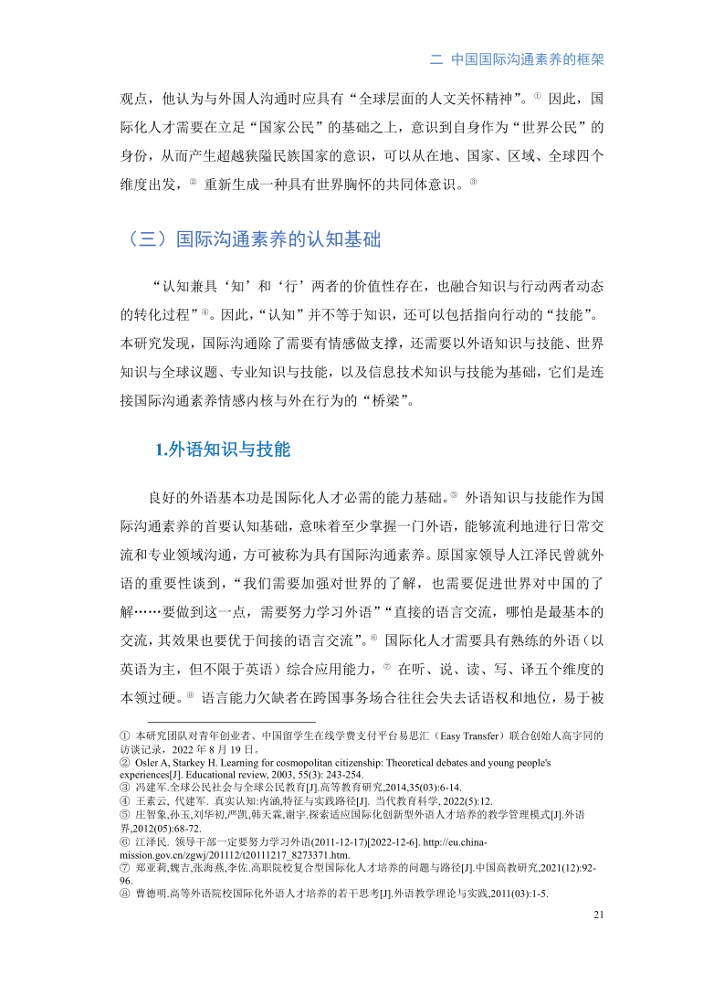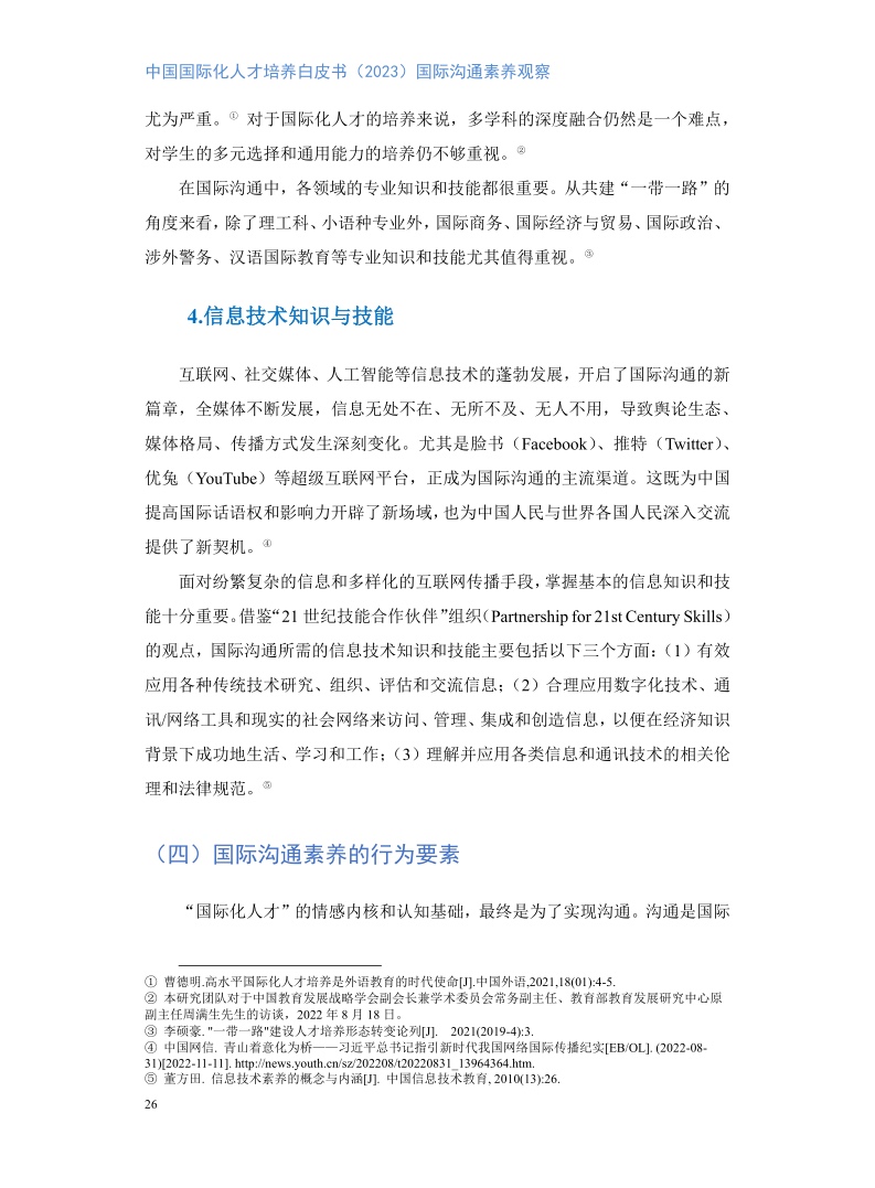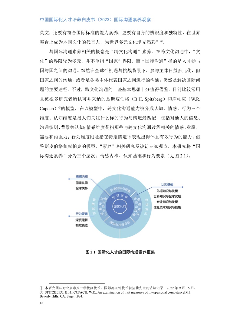 1、本报告基于调查研究分析,构建了国际化人才的国际沟通素养框架,包括情感内核、认知基础、行为要素三个层次。情感内核是国际沟通素养的基础与前提,包括国家认同、全球关怀两个重要元素。认知基础是连接情感内核和行为要素的桥梁,包括外语知识与技能、世界知识与全球议题、专业知识与技能,以及信息技术知识与技能。行为要素是情感内核和认知基础的外显方式,可促进情感内核和认知基础的形成,包括深度理解和有效表达两种形式。