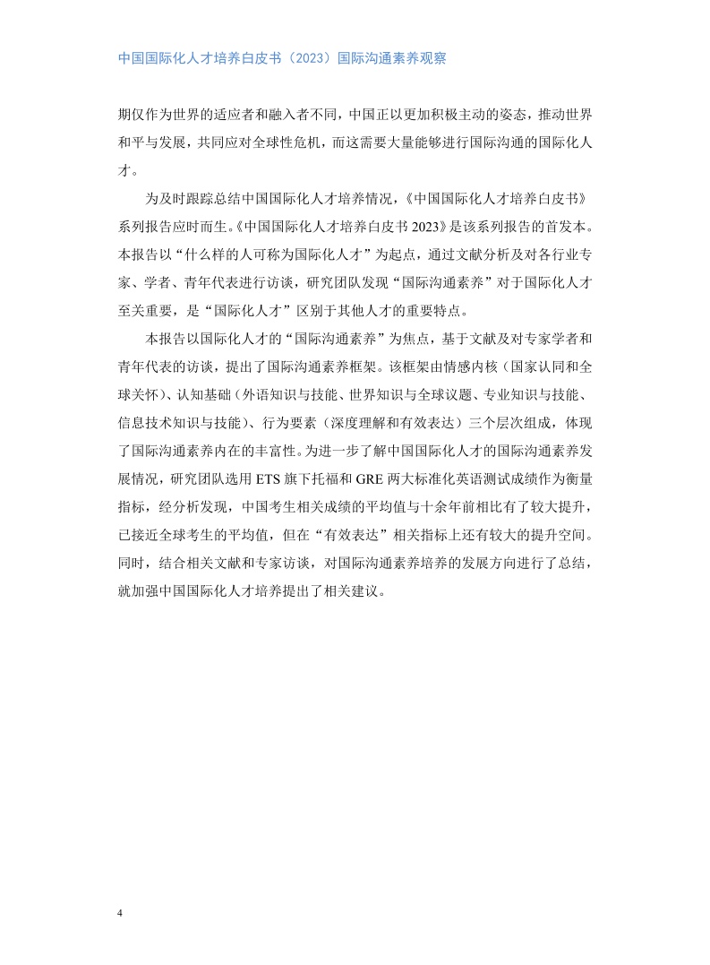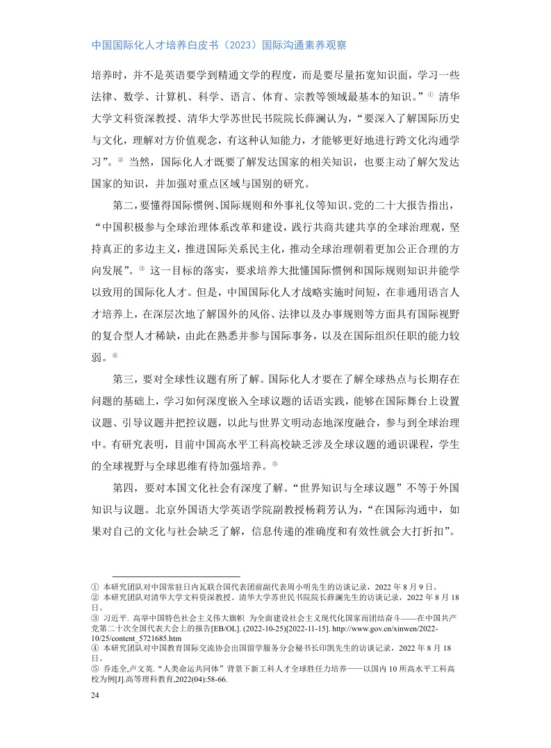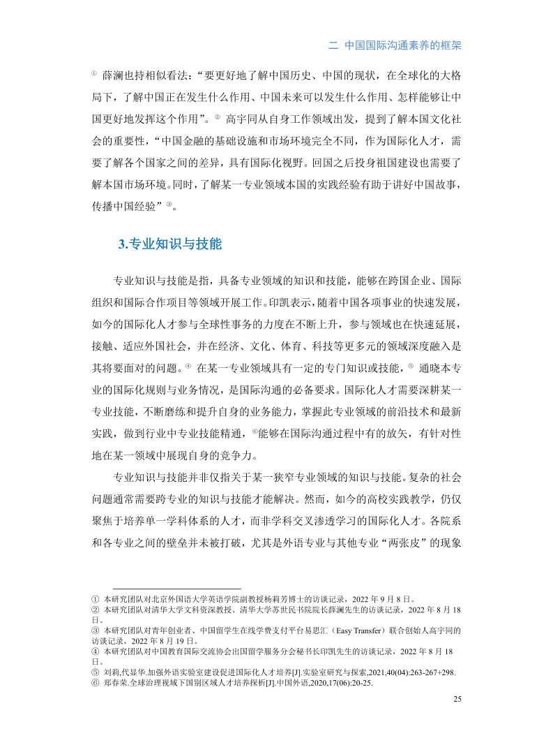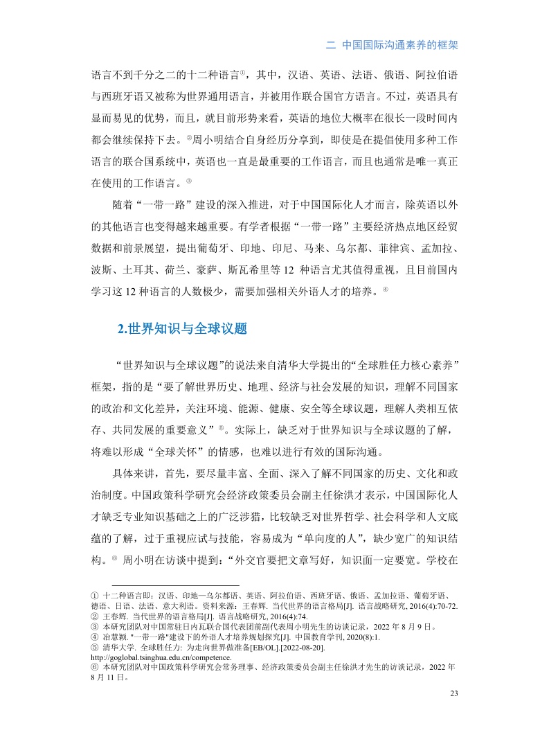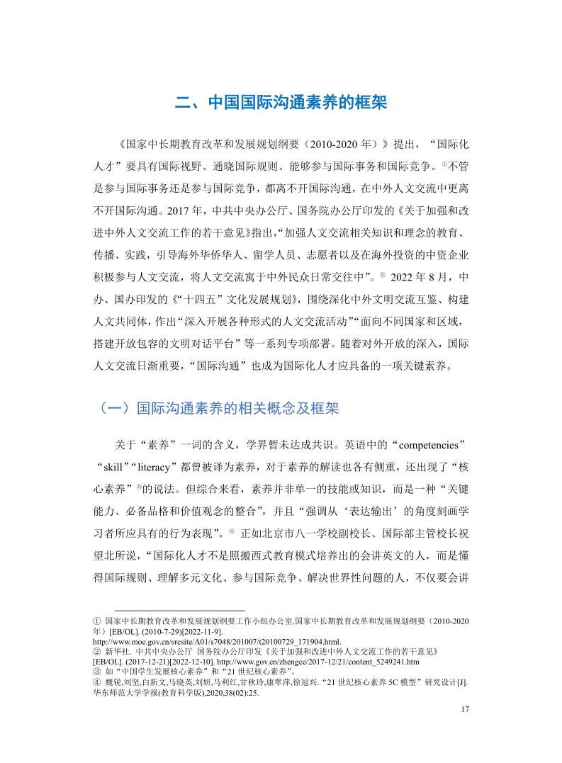 1、本报告基于调查研究分析,构建了国际化人才的国际沟通素养框架,包括情感内核、认知基础、行为要素三个层次。情感内核是国际沟通素养的基础与前提,包括国家认同、全球关怀两个重要元素。认知基础是连接情感内核和行为要素的桥梁,包括外语知识与技能、世界知识与全球议题、专业知识与技能,以及信息技术知识与技能。行为要素是情感内核和认知基础的外显方式,可促进情感内核和认知基础的形成,包括深度理解和有效表达两种形式。