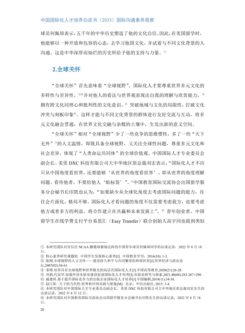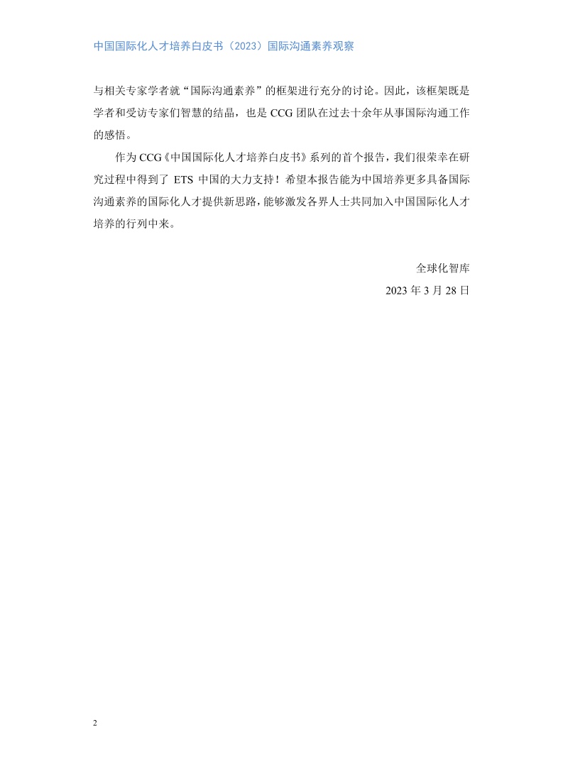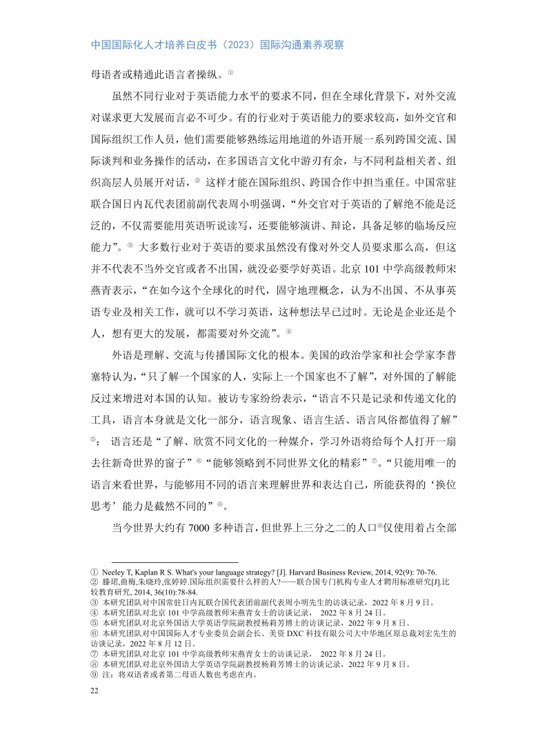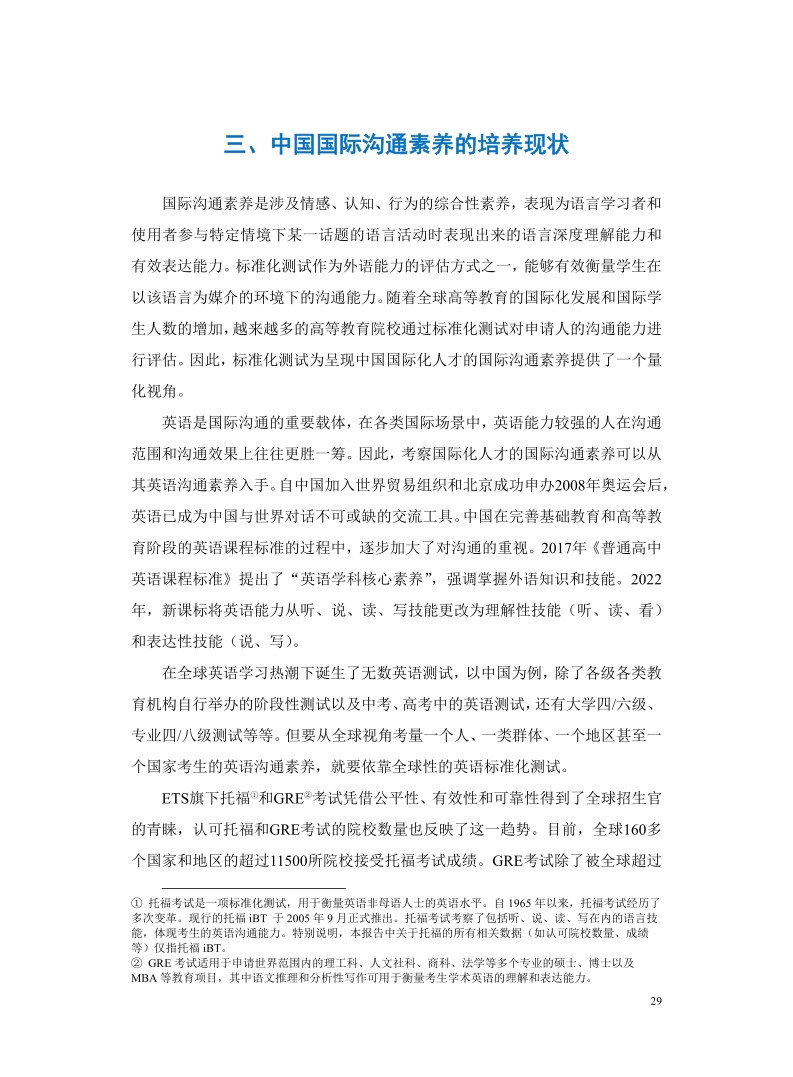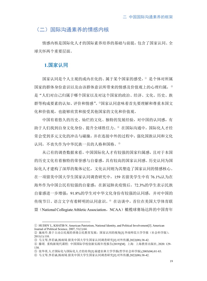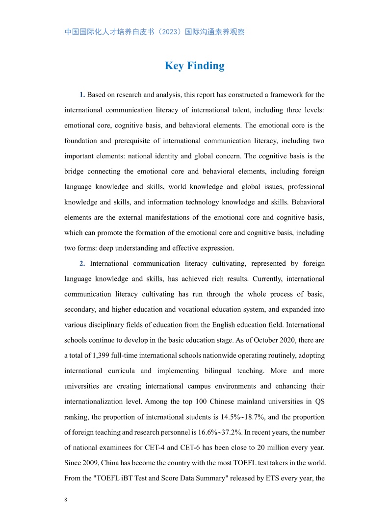 1、本报告基于调查研究分析,构建了国际化人才的国际沟通素养框架,包括情感内核、认知基础、行为要素三个层次。情感内核是国际沟通素养的基础与前提,包括国家认同、全球关怀两个重要元素。认知基础是连接情感内核和行为要素的桥梁,包括外语知识与技能、世界知识与全球议题、专业知识与技能,以及信息技术知识与技能。行为要素是情感内核和认知基础的外显方式,可促进情感内核和认知基础的形成,包括深度理解和有效表达两种形式。