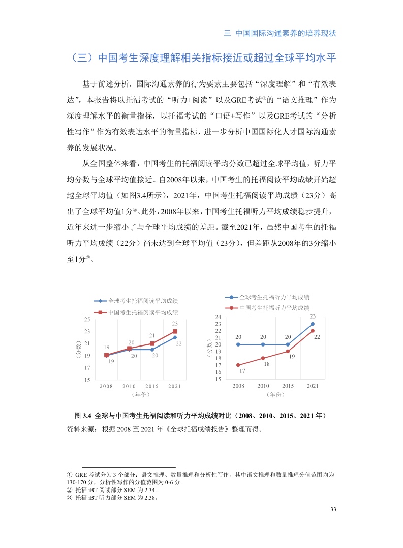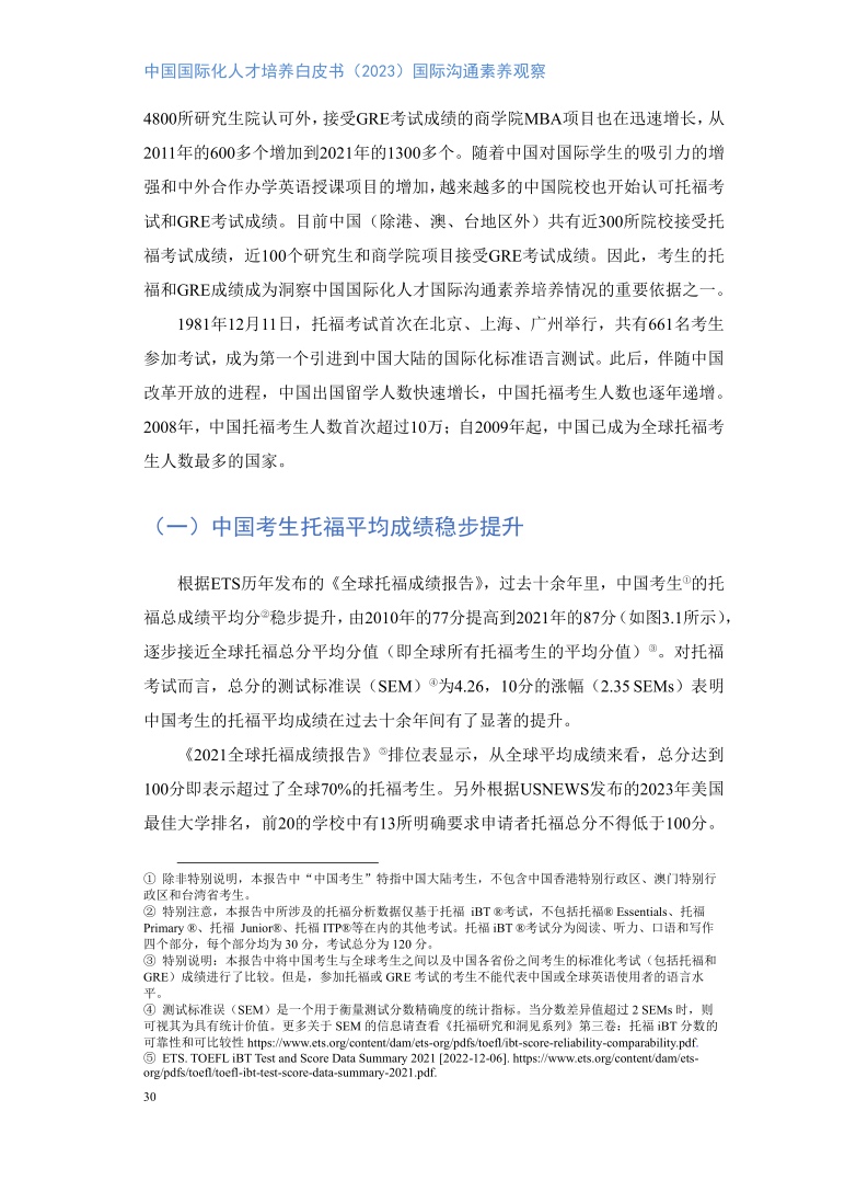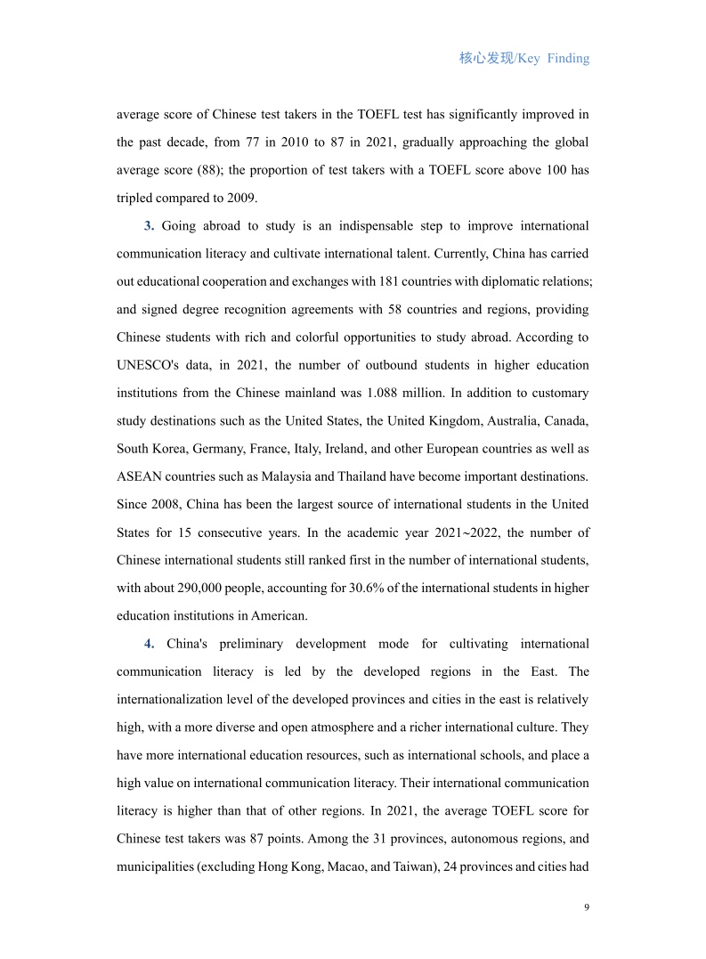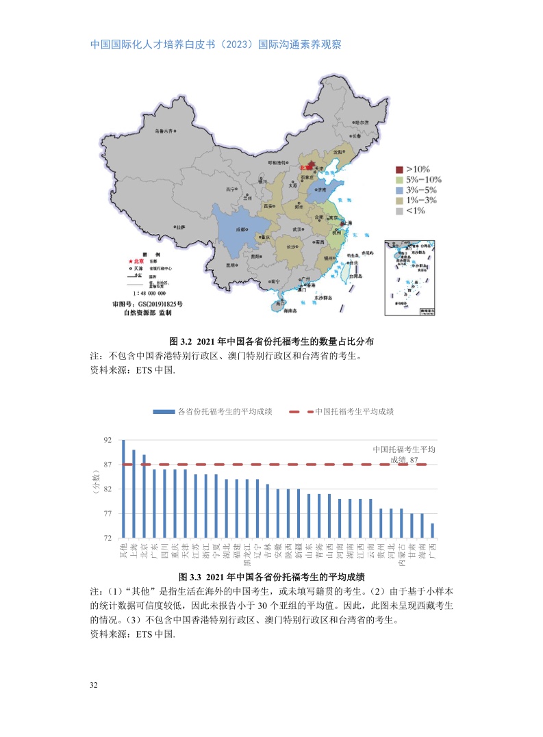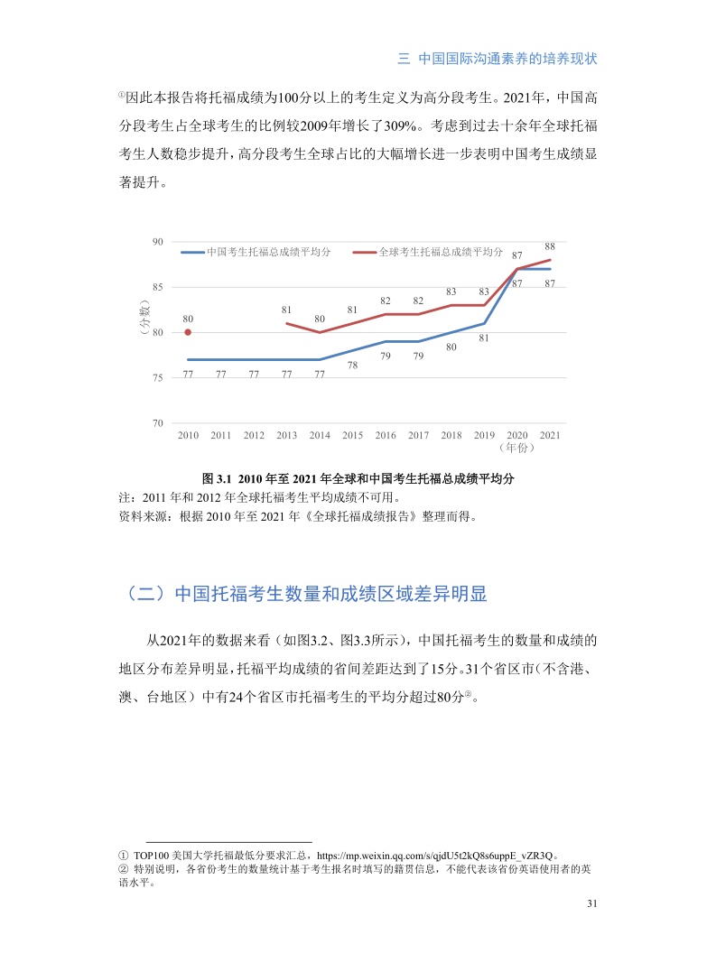 2. 以外语知识与技能为代表的国际沟通素养培养取得较为丰富的成绩。目前国际沟通素养培养已贯穿初、中、高等教育及职业教育体系全过程,并从英语教育领域拓展融入不同的学科教育领域。基础教育阶段,国际学校不断发展,截至2020年10月,全国正常运营、采用国际课程、实行双语教学的各类全日制国际学校共计1399所。越来越多高校创造国际化校园环境,提升国际化水平,2023年QS世界大学排名前100的中国大陆高校中,国际学生占比为5.4%~17.5%、国际教师比例为6%~47%。自2009年起,中国已成为全球托福考生人数最多的国家。从ETS每年发布的《全球托福考生成绩报告》来看,过去十余年,中国考生的托福考试成绩显著提升,平均成绩由2010年的77分提高到2021年的87分,逐步接近全球考生的平均分(88分);托福成绩100分以上的考生人数占全球考生人数的比例较2009年增长了三倍。