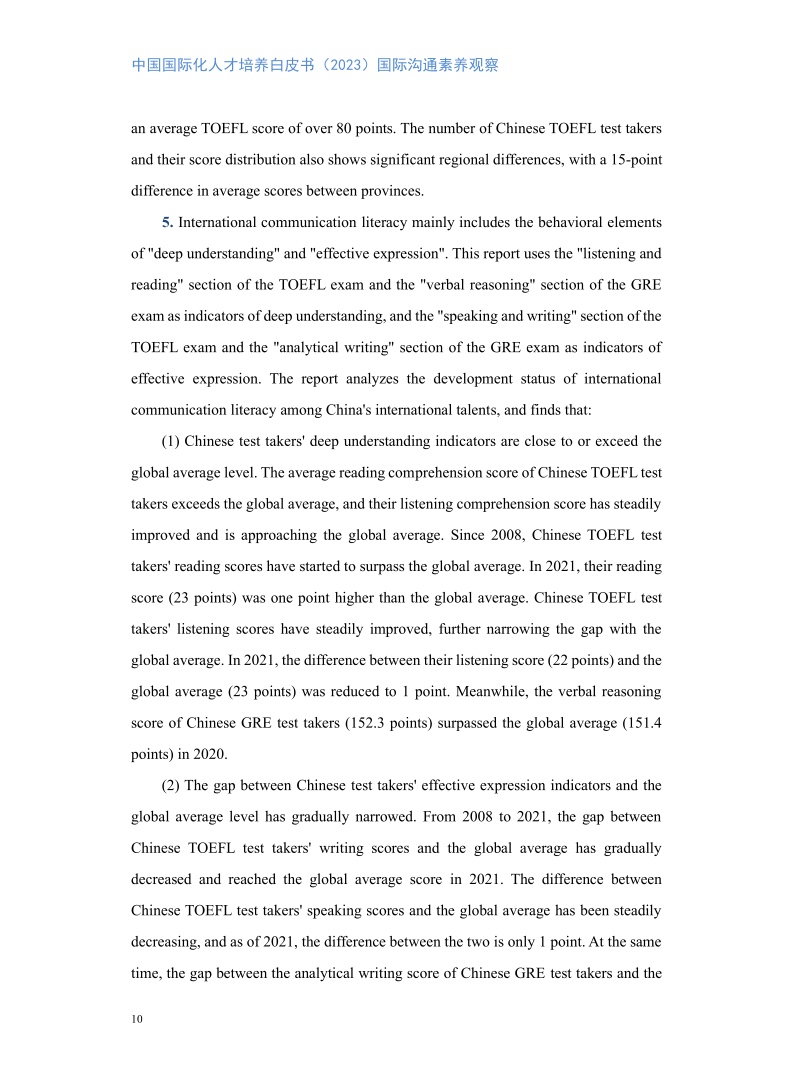5. 国际沟通素养主要包括“深度理解”和“有效表达”两方面的行为要素,本报告以托福考试的“听力+阅读”以及GRE考试的“语文推理”作为深度理解水平的衡量指标,以托福考试的“口语+写作”以及GRE考试的“分析性写作”为有效表达的衡量指标,分析中国国际化人才国际沟通素养的发展状况,并发现: