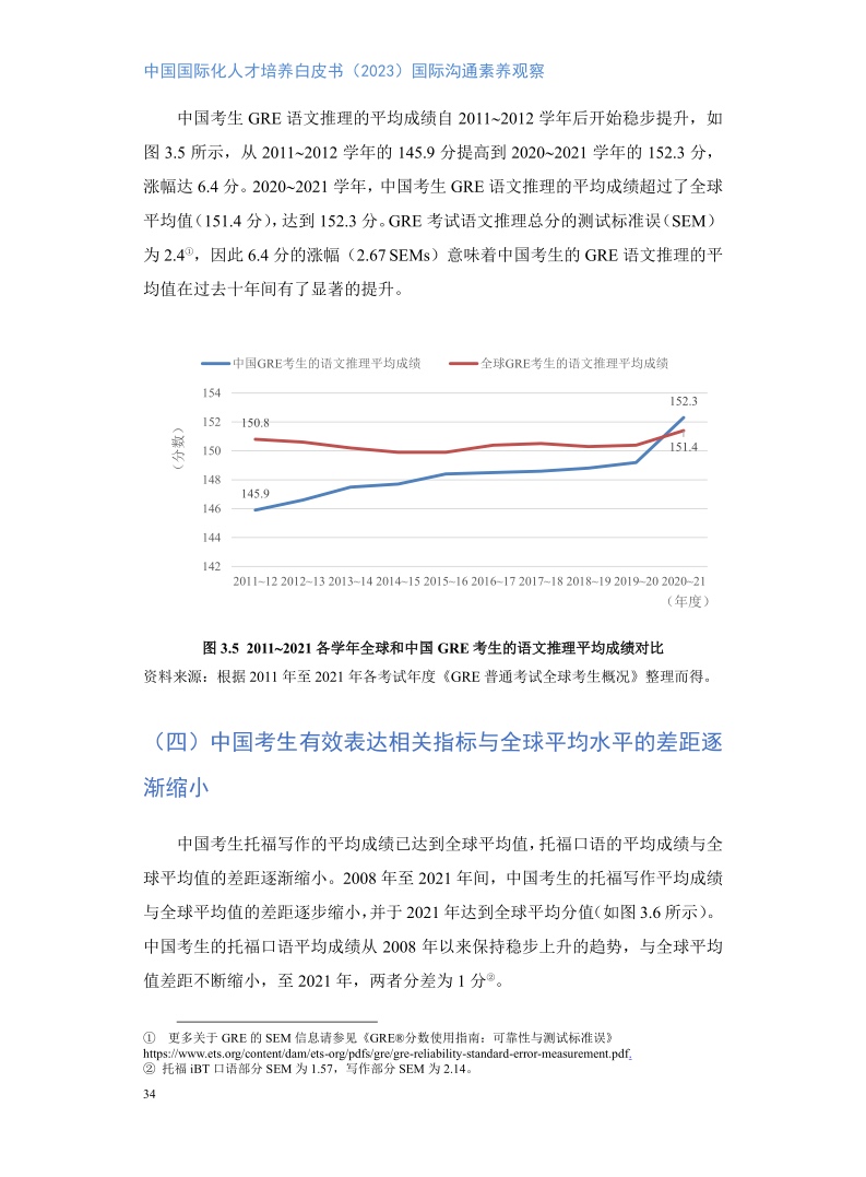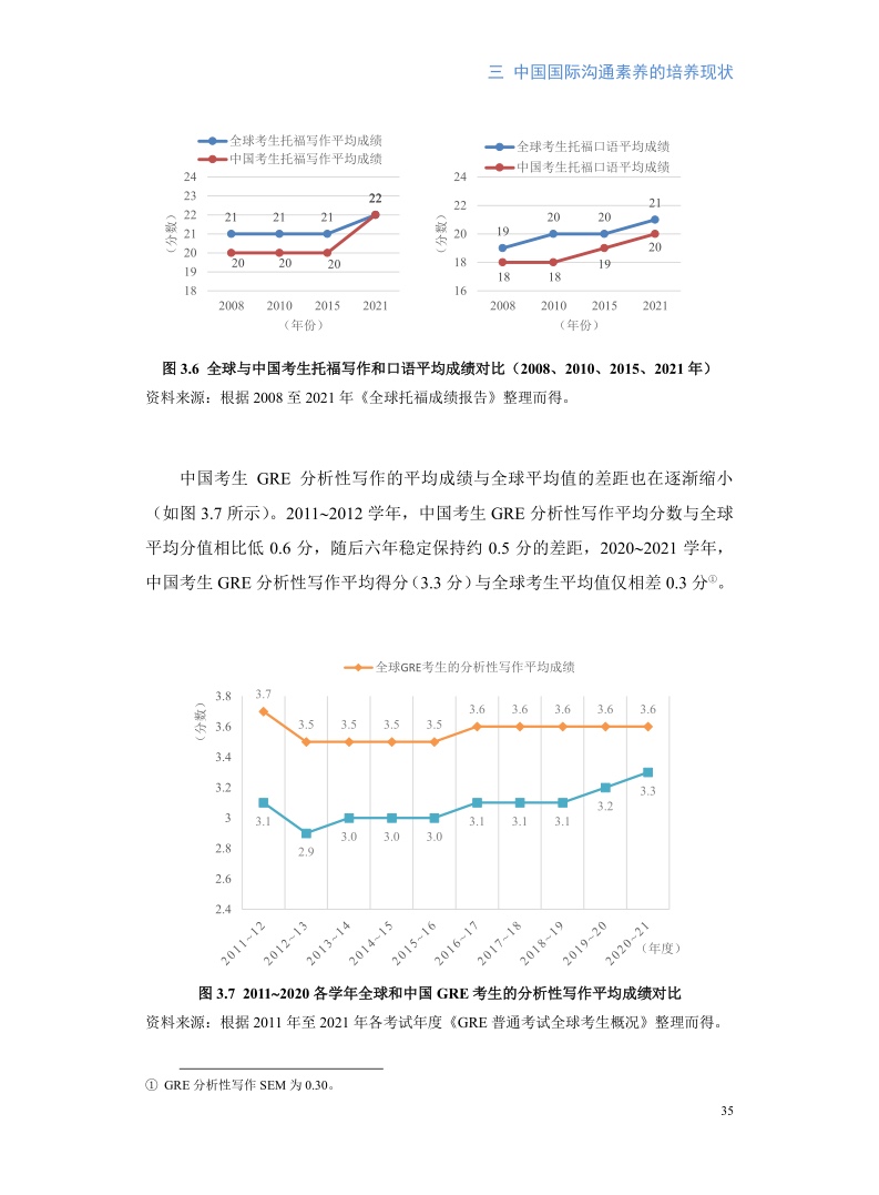 (2)中国考生有效表达相关指标与全球平均水平的差距逐渐缩小。2008年至2021年间,中国考生的托福写作成绩与全球平均值的差距逐步减小,并于2021年达到全球平均分值。中国考生的托福口语成绩与全球平均值差距不断缩小,至2021年,两者分差为1分。同时,GRE中国考生的分析性写作成绩与全球平均值的差距逐渐缩小。2011~2012学年,中国考生分析性写作得分与全球得分相比低0.6分,随后六年稳定保持约0.5分的差距,2020年,中国考生分析性写作得分(3.3分)与全球考生平均值的差距缩小至0.3分。