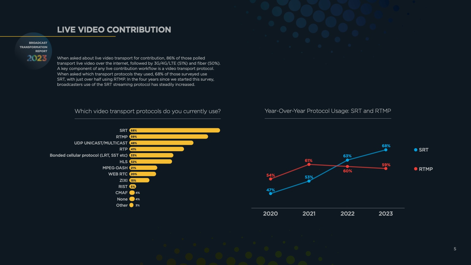 68%的受访者使用SRT进行实时视频传输,因为互联网在视频贡献方面的使用处于领先地位。