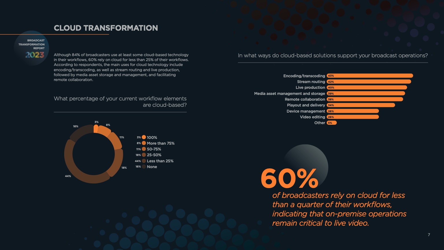 84%的广播公司在其工作流程中至少使用了一些基于云计算的技术,其中60%的广播公司在不到四分之一的工作流程中依赖于云计算,这表明现场运营对视频直播仍然至关重要。