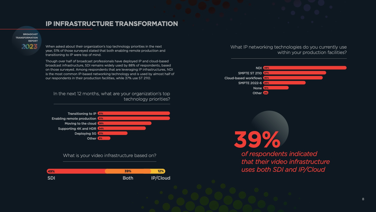 51%的受访者表示,向IP过渡是他们组织未来12个月的首要技术任务之一,超过一半的受访广播公司已经在使用IP基础设施。