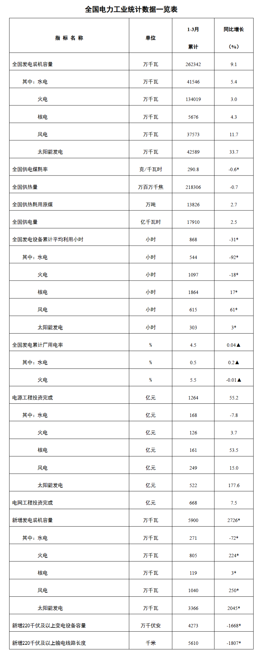 近日消息,国家能源局发布了 1-3 月份全国电力工业统计数据。