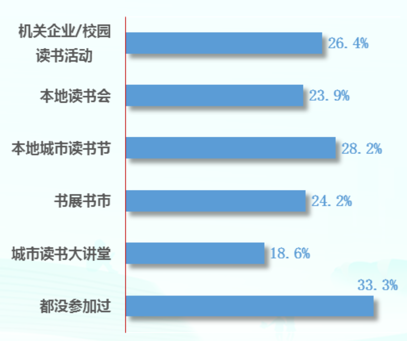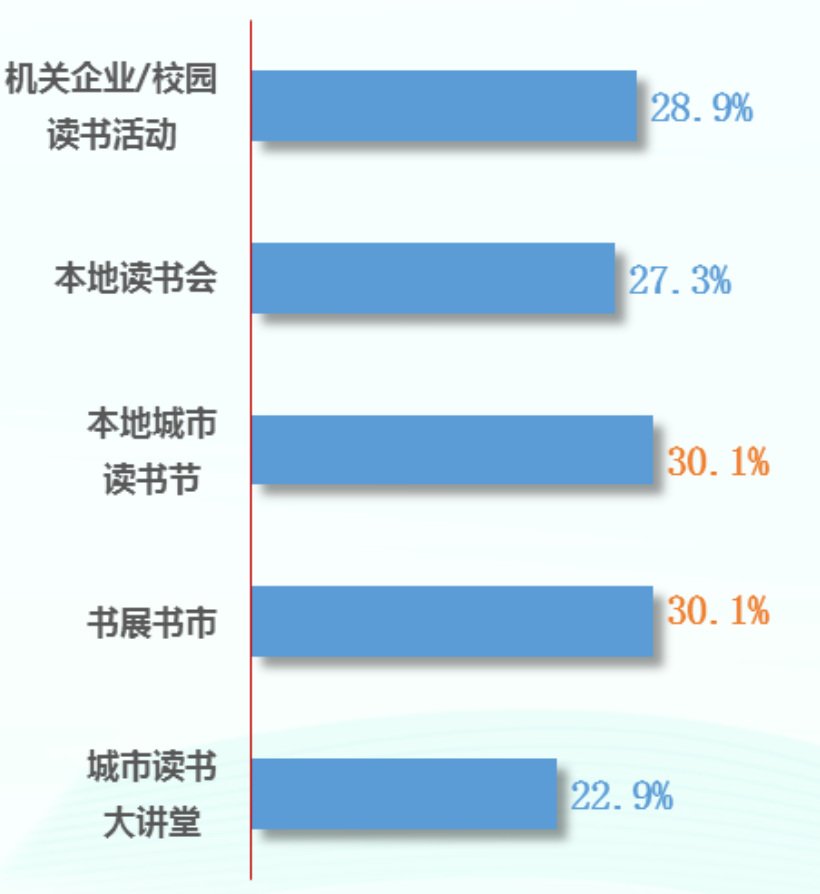 2022 年我国成年国民对全民阅读品牌活动的参与度达 66.7%。其中,“本地城市读书节”的参与度为 28.2%;“机关企业 / 校园读书活动”的参与度位列其后,为 26.4%;“本地读书会”的参与度为 23.9%;“书展书市”的参与度为 24.2%;“城市读书大讲堂”的参与度为 18.6%。