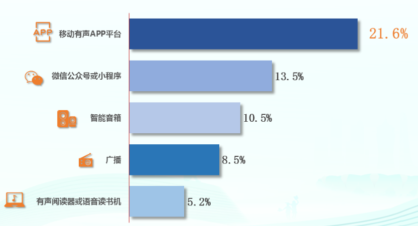 对我国成年国民听书介质的考察发现,选择“移动有声 App 平台”听书的国民比例较高,为 21.6%;有 13.5% 的人选择通过“微信公众号或小程序”听书;有 10.5% 的人选择通过“智能音箱”听书;分别有 8.5% 和 5.2% 的人选择通过“广播”和“有声阅读器或语音读书机”听书。