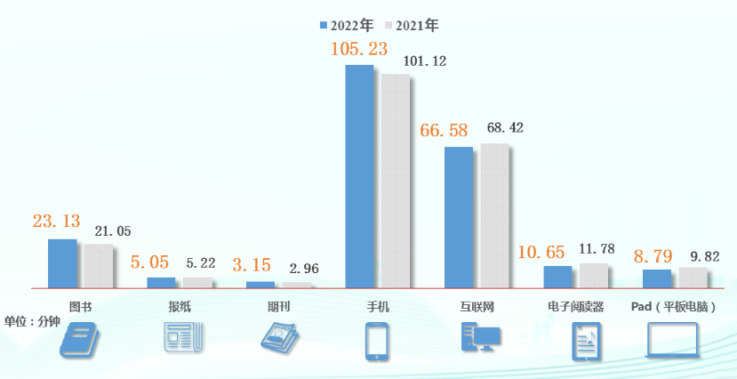 在传统纸质媒介中,2022 年我国成年国民人均每天读书时间最长,为 23.13 分钟,比 2021 年的 21.05 分钟增加了 2.08 分钟;人均每天读报时长为 5.05 分钟,少于 2021 年的 5.22 分钟;人均每天阅读期刊时长为 3.15 分钟,高于 2021 年的 2.96 分钟。