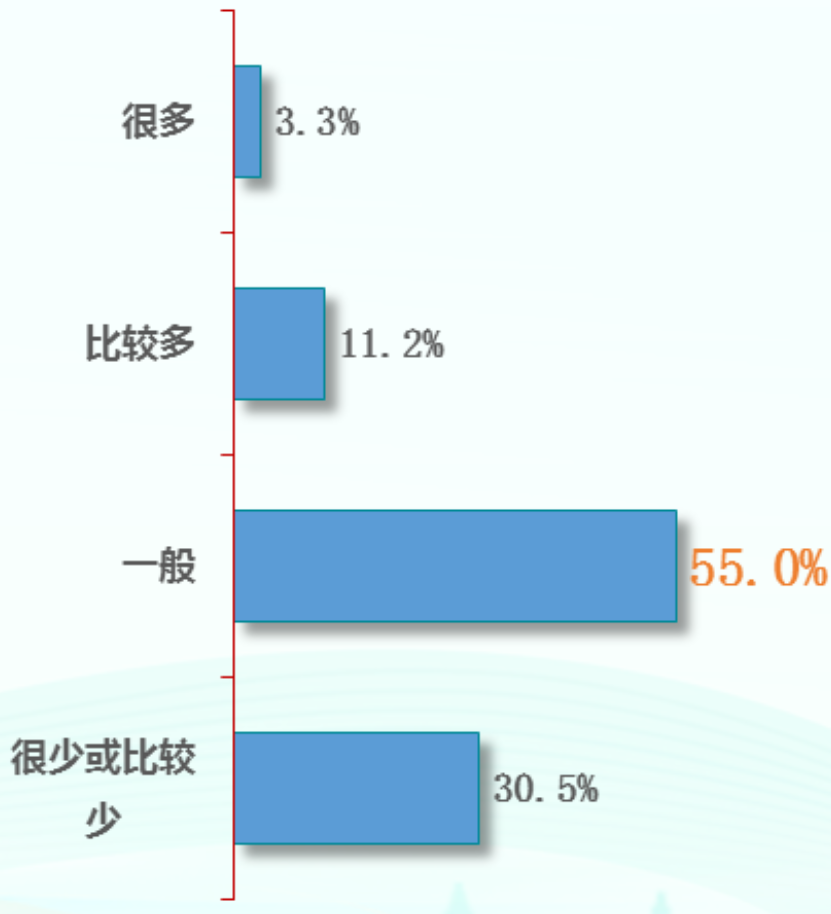 从成年国民对个人阅读数量的评价来看,2022 年,有 3.3% 的国民认为自己的阅读数量很多,有 11.2% 的国民认为自己的阅读数量比较多,有 55.0% 的国民认为自己的阅读数量一般,有 30.5% 的国民认为自己的阅读数量很少或比较少。