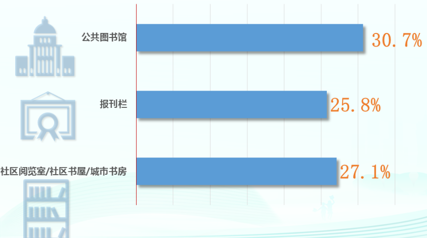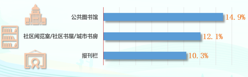 2022 年我国城镇成年居民对居住的街道附近有公共图书馆、社区阅览室 / 社区书屋 / 城市书房、报刊栏等至少一种公共阅读服务设施的知晓率为 52.5%。其中,对公共图书馆的知晓率为 30.7%;对报刊栏的知晓率为 25.8%;对社区阅览室 / 社区书屋 / 城市书房的知晓率为 27.1%。