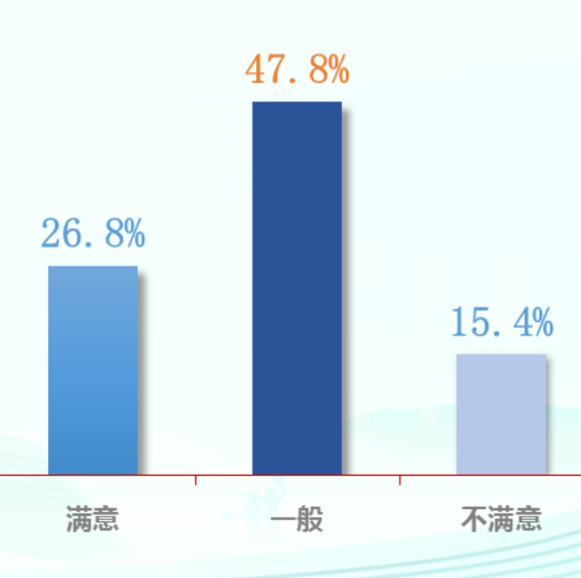 从成年国民对于个人总体阅读情况的评价来看,有 26.8% 的国民表示满意(非常满意或比较满意);有 15.4% 的国民表示不满意(比较不满意或非常不满意);另有 47.8% 的国民表示一般。