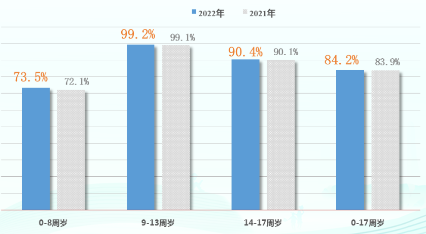 从未成年人的图书阅读率来看,2022 年 0-8 周岁儿童图书阅读率为 73.5%,较 2021 年的 72.1% 提高了 1.4 个百分点;9-13 周岁少年儿童图书阅读率为 99.2%,较 2021 年的 99.1% 提高了 0.1 个百分点;14-17 周岁青少年图书阅读率为 90.4%,较 2021 年的 90.1% 提高了 0.3 个百分点。