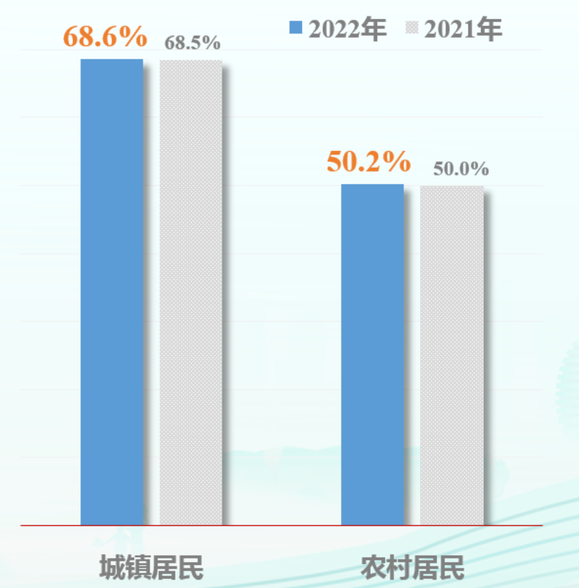 对我国城乡成年居民 2022 年图书阅读率的考察发现,我国城镇居民的图书阅读率为 68.6%,高于 2021 年的 68.5%;农村居民的图书阅读率为 50.2%,高于 2021 年的 50.0%。