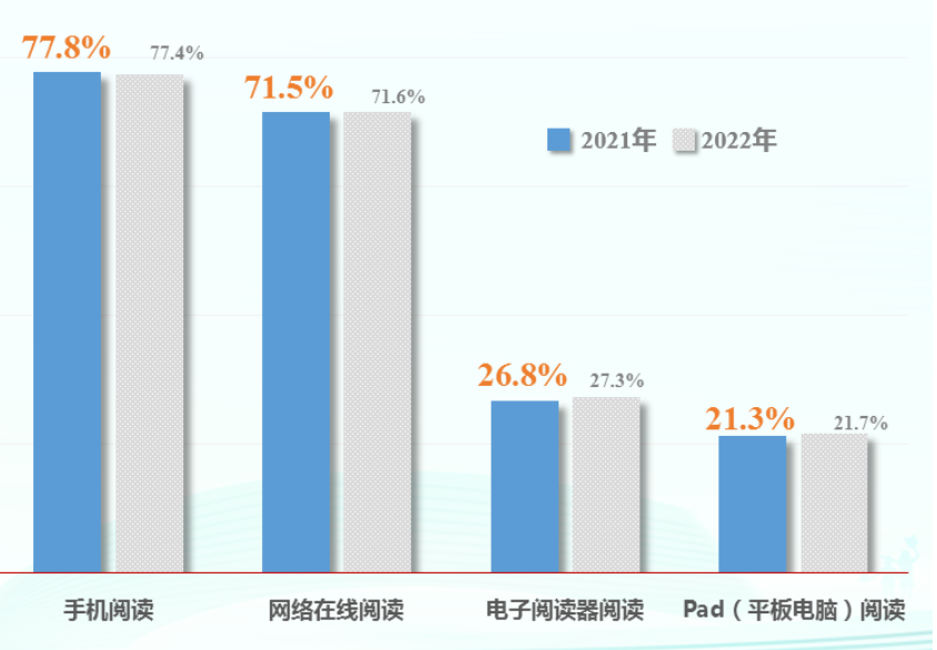 2022 年有 77.8% 的成年国民进行过手机阅读,较 2021 年的 77.4% 增长了 0.4 个百分点;71.5% 的成年国民进行过网络在线阅读,较 2021 年的 71.6% 基本持平;26.8% 的成年国民在电子阅读器上阅读,比 2021 年的 27.3% 减少了 0.5 个百分点;21.3% 的成年国民使用 Pad(平板电脑)进行数字化阅读,比 2021 年的 21.7% 减少了 0.4 个百分点。
