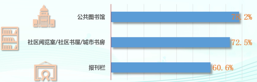在使用过以上公共阅读服务设施的城镇成年居民中,公共图书馆的使用满意度最高,为 78.2%;社区阅览室 / 社区书屋 / 城市书房的使用满意度为 72.5%;报刊栏的使用满意度为 60.6%。