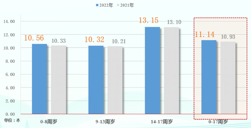 2022 年我国 0-17 周岁未成年人图书阅读率为 84.2%,较 2021 年的 83.9% 提高了 0.3 个百分点。2022 年我国 0—17 周岁未成年人的人均图书阅读量为 11.14 本,比 2021 年的 10.93 本增加了 0.21 本。