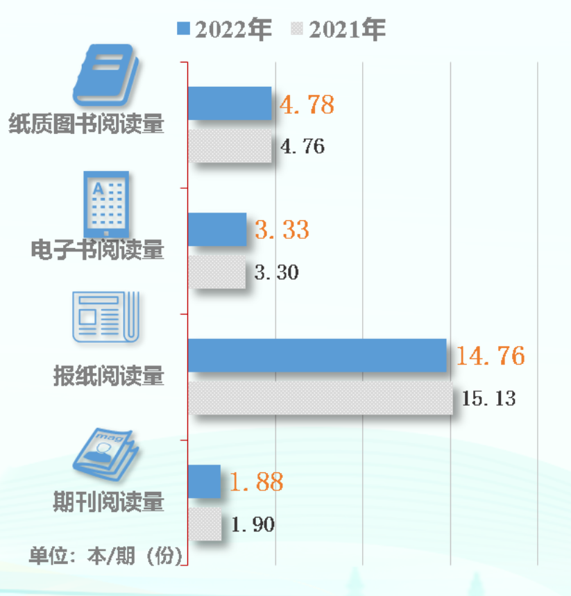 从成年国民对各类出版物阅读量的考察看,2022 年我国成年国民人均纸质图书阅读量为 4.78 本,高于 2021 年的 4.76 本。人均电子书阅读量为 3.33 本,高于 2021 年的 3.30 本。纸质报纸的人均阅读量为 14.76 期(份),低于 2021 年的 15.13 期(份)。纸质期刊的人均阅读量为 1.88 期(份),低于 2021 年的 1.90 期(份)。