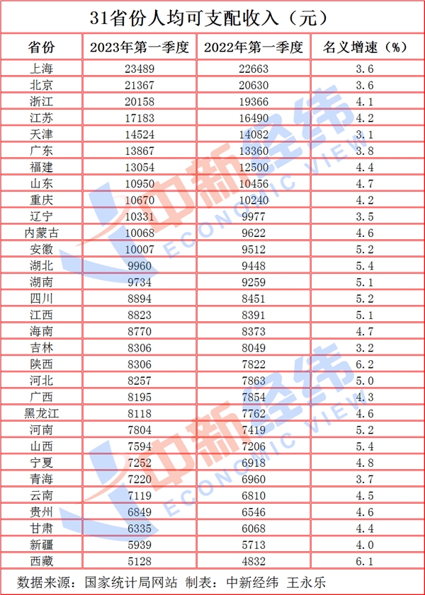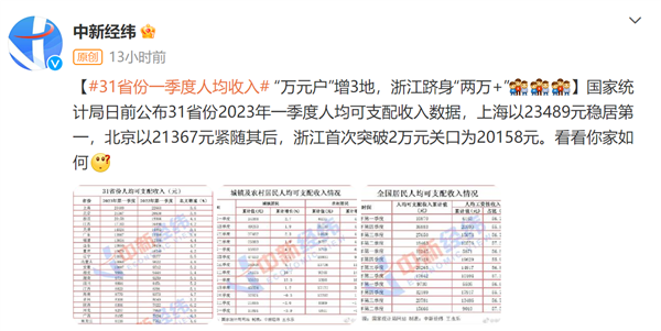 官方日前公布31省份2023年一季度人均可支配收入数据,上海以23489元稳居第一,北京以21367元紧随其后,浙江首次突破2万元关口为20158元。