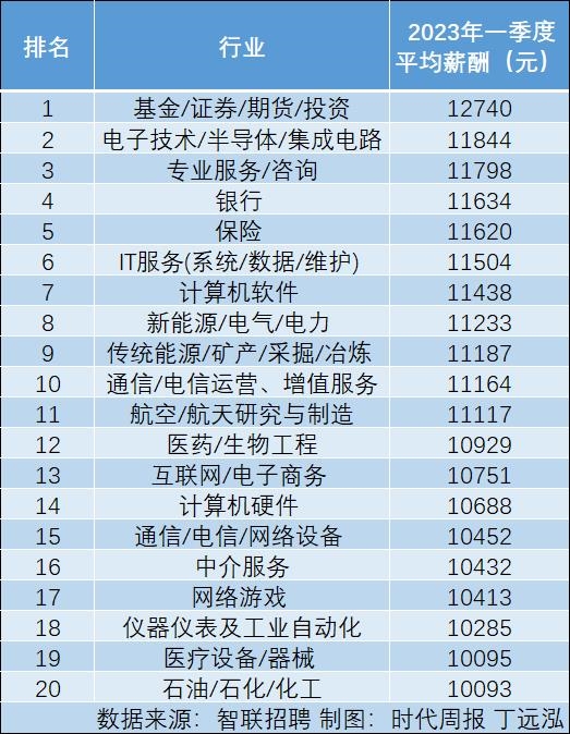 根据智联招聘发布的《中国企业招聘薪酬报告》(下称“报告”),2023年第一季度中,共有20个行业的平均月薪超1万元(主要分布在高技术制造业、金融业和互联网行业。)。除了大家所熟悉的金融行业薪资水平排名靠前,一些高技术制造业、新能源行业的薪酬增长也势头强劲。