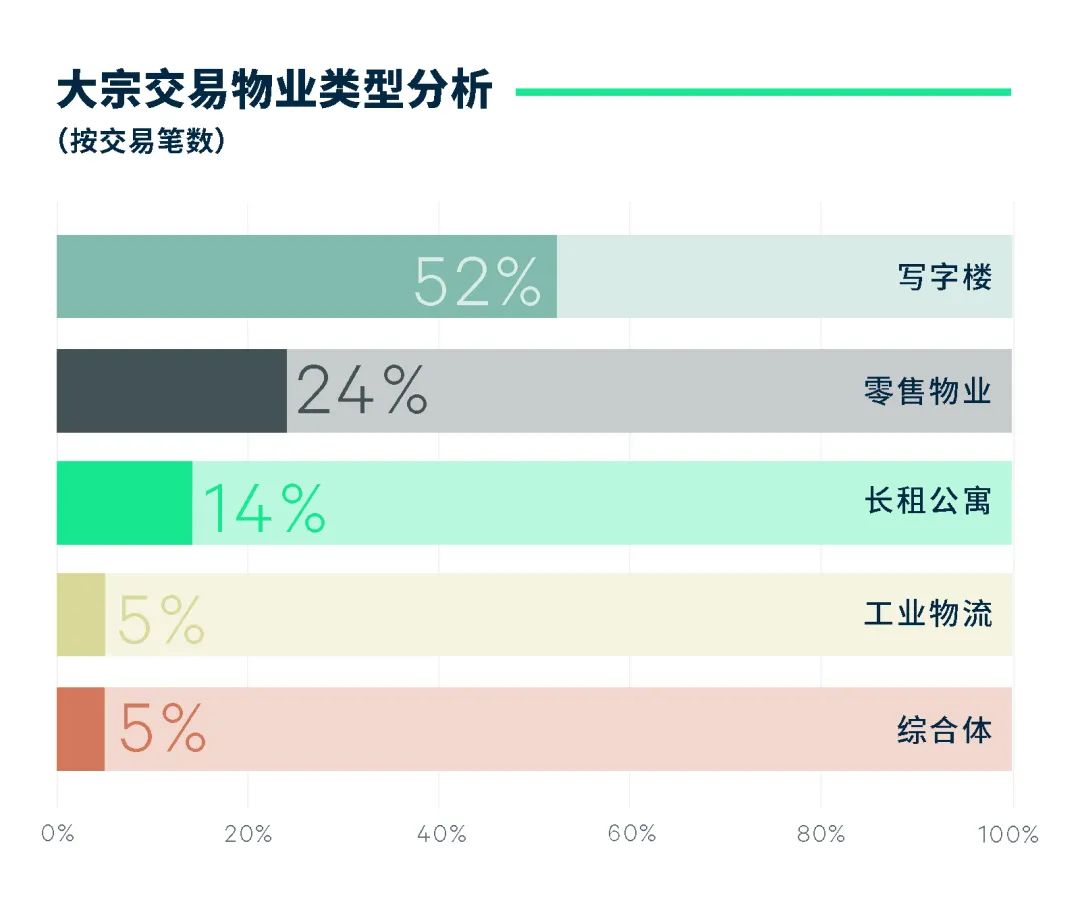 写字楼物业仍为最受欢迎的资产类型,尤以商务园区物业的交易表现最为亮眼,交易金额突破百亿,成熟子板块如张江及金桥均录得稳定运营的优质项目在本季度易手;写字楼自用买家购买力持续坚挺,季内北外滩与黄浦滨江等沿江板块吸引国资背景企业进驻,长风、张江与浦江等科创氛围浓厚区域则受到集成电路、软件开发等高科技公司的青睐。随着首单市场化机构运营的保障性租赁住房公募REIT成功发行,叠加租赁市场需求稳定与租金韧性之表现,长租公寓愈发受到投资者追捧。此外,零售相关物业交易在本季度有所回暖,位于非核心板块的商业裙房与临街店铺等资产类型均有所成交。