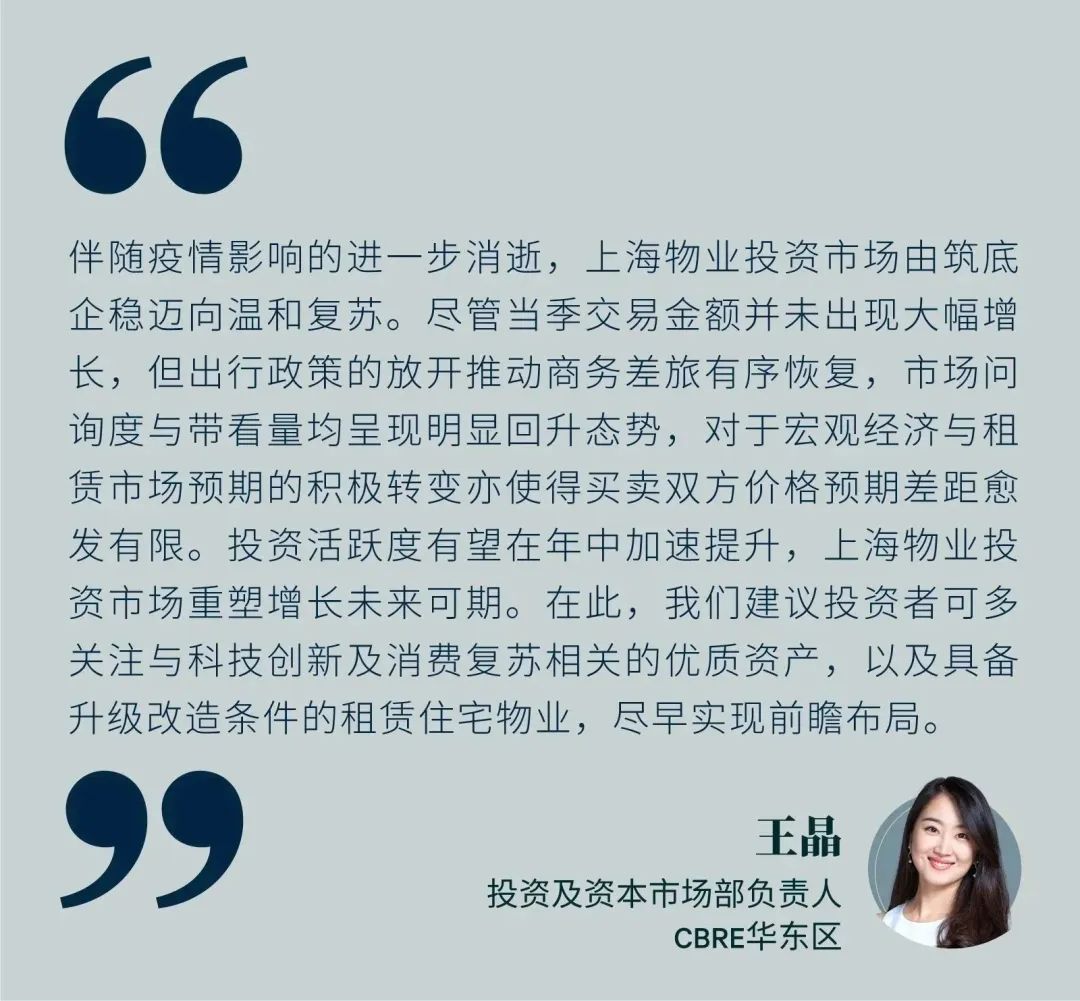 2023年第一季度,上海物业投资市场录得21笔大宗交易,交易金额达186.9亿元,环比下降25.4%。市场信心稳步恢复,投资者问询量明显提高,交易活跃度预计将在年中有所体现。