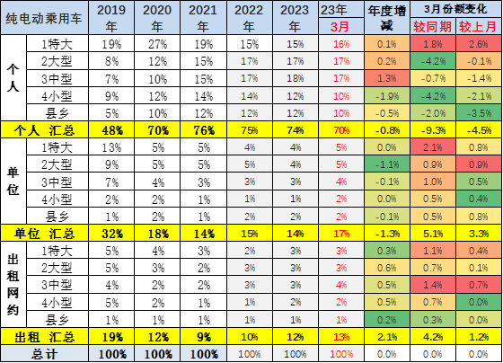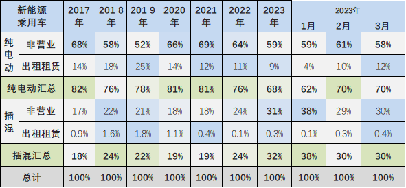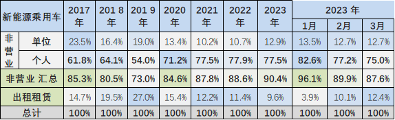 2017-2019 年新能源乘用车的出租租赁类占比逐步提升,随后 2020 年开始的纯电动出租租赁的占比持续下降。今年的市场需求逐步走稳,纯电动 2023 年 3 月出租租赁的占比在 12.4%,较年初提升较大。