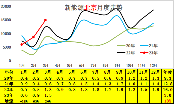 北京市场 2022 年新能源车市场走势相对较平稳,2023 年 3 月销量达到 1.5 万台,稍高于去年同期,牌照指标充分消化。2023 年的累计销量同比增长 18% 的表现较好。