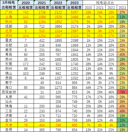 3 月的各地出租市场更新电动化力度较大。尤其是广州、上海、北京等地区相对于前几年的 3 月更新数量大幅增长,体现电动化的公共领域较强特征。