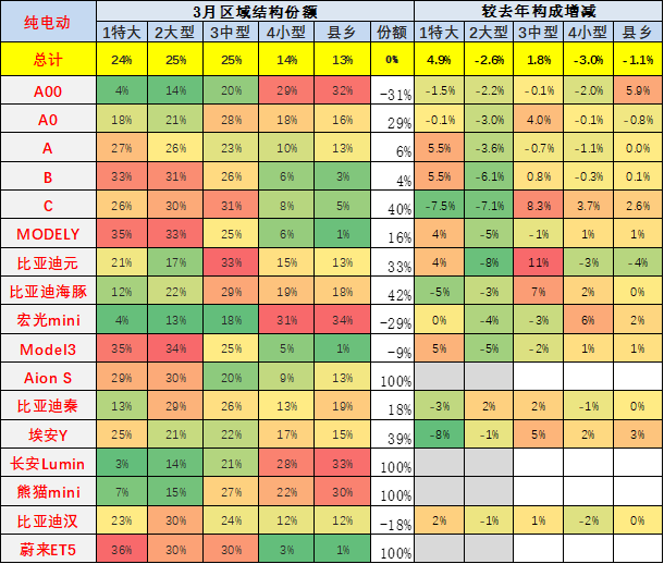 从主力车型的表现来看,也是体现了主力车型在大中城市的表现改善,尤其是 3 月以比亚迪为代表的增量表现较好。从特斯拉来看, 3 月份较同期的的主力区域更延伸到县乡市场,特大型城市的纯电动市场增长相对较好。