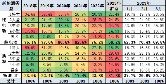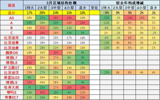 3 月的插混走强,大中型非限购限购城市仍是插混主力,限购城市需求占比下降,县乡市场的插混形成较好的推动。