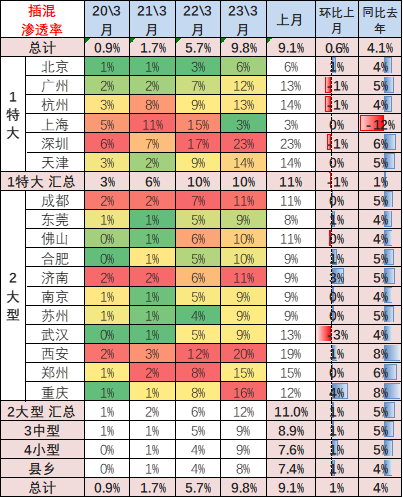 2023 年 3 月全国插混市场也达到 9.8% 的前期最高水平。插混在全国各地市场渗透率都持续增长,尤其在特大型市,今年 3 月插混车市场占比达到 10%;在中小城市市场的插混市场的占比也呈现持续提升的特征,各类城市间的插混渗透率差距相对缩小。