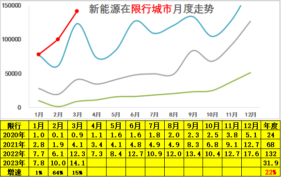新能源车在限行城市的表现相对较强,2023 年 3 月份仅达到 14 万台水平,同比增长速度达到 15% 的较好水平。2022 年累计的新能源车的销量达到 132 万的水平,同比增长 94%,远高于我们总体的车市增长,也高于我们总体新能源车的平均增长速度,体现了限行城市购买新能源车的热情相对较高。