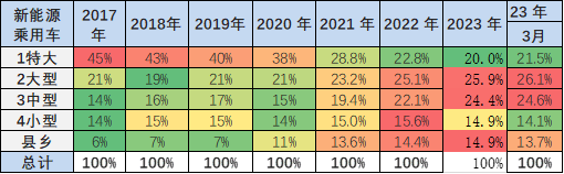 新能源乘用车前几年主要在限购特大城市需求较强,近期持续下行。2023 年新能源乘用车在特大城市占到总销量 20%,较 2022 年下降 3 个百分点,这也是说明限购城市的新能源车市场销量逐步增速放缓,基础的人口规模对需求有约束。由于人口基数大,公共交通差,近期的大中型城市市场需求旺盛,县乡市场新能源逐步启动。