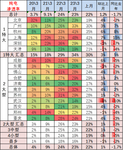 上海由于插混牌照政策的拉动,3 月插混占比 3%,回落较大。广州、深圳、天津的插混市场在 3 月也环比下降较大。